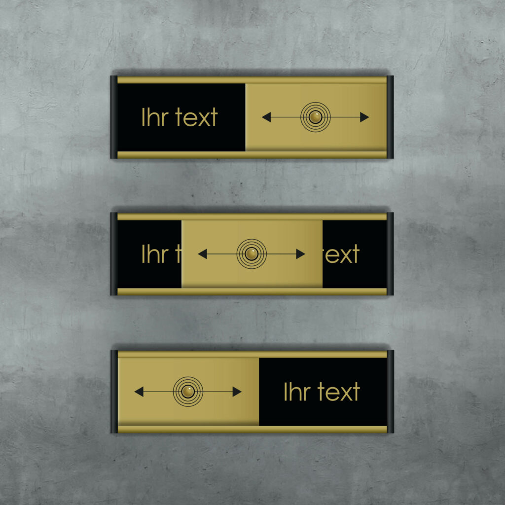 Schiebeschild Gold 100 x 31 mm mit optionalem Text lässt sich einfach und bequem außerhalb eines Zimmers, Büros oder einer Toilette anbringen. Es ist ein flexibles und anpassungsfähiges Schild, da Sie den Text selbst wählen. HINWEIS! Achten Sie darauf, keine zu langen Wörter zu verwenden, da der Platz begrenzt ist (max. 10 Zeichen).