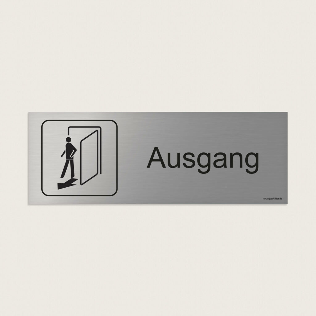 Ein Hinweisschild mit Symbol und dem Text „Ausgang“, das zur eindeutigen Kennzeichnung von Ausgängen in Gebäuden dient – erleichtert die Orientierung und weist klar auf den Weg ins Freie hin..