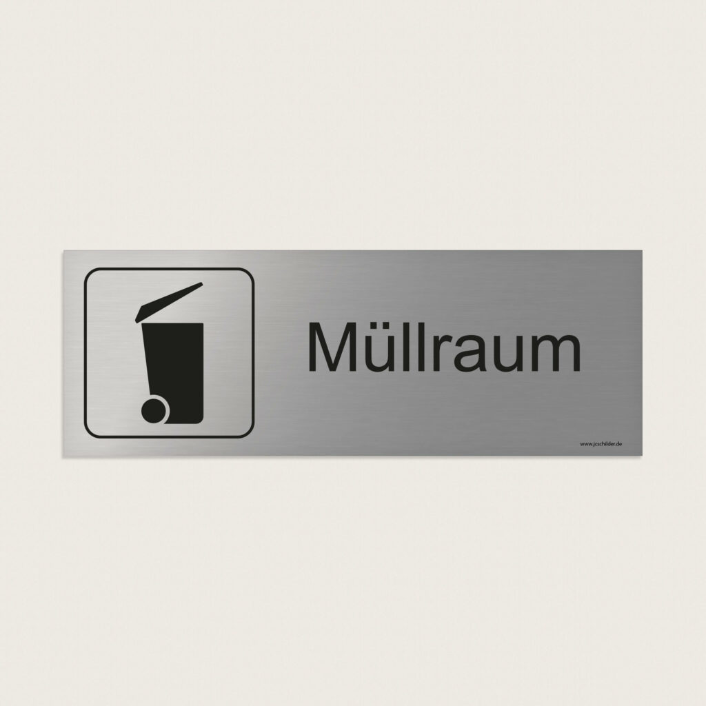 Ein Hinweisschild mit Symbol und dem Text „Müllraum“, das zur eindeutigen Kennzeichnung von Abfallräumen dient – erleichtert die Orientierung und weist klar auf den vorgesehenen Bereich hin.