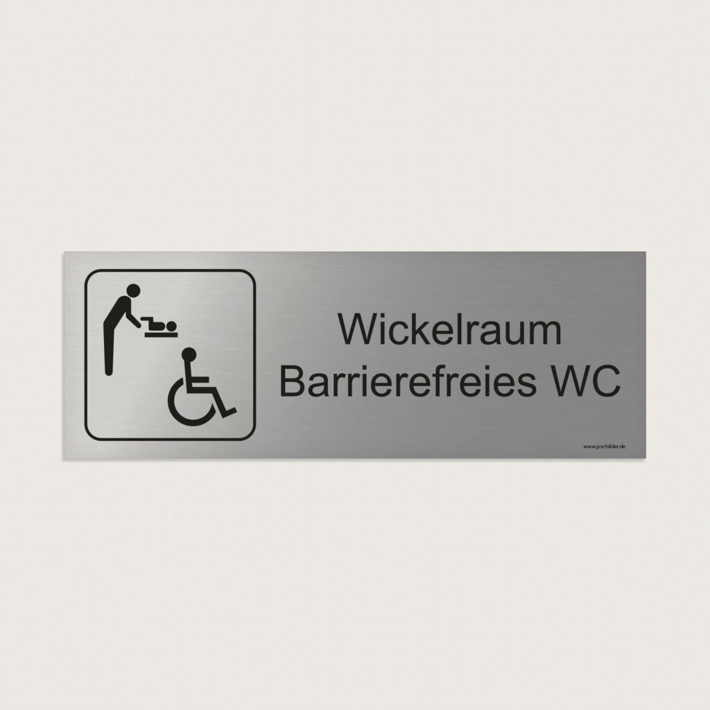 Ein Hinweisschild mit Symbol und dem Text „Wickelraum Barrierefreies WC“, das zur eindeutigen Kennzeichnung von Wickelräumen mit barrierefreiem WC dient – erleichtert die Orientierung und weist klar auf den vorgesehenen Bereich hin.