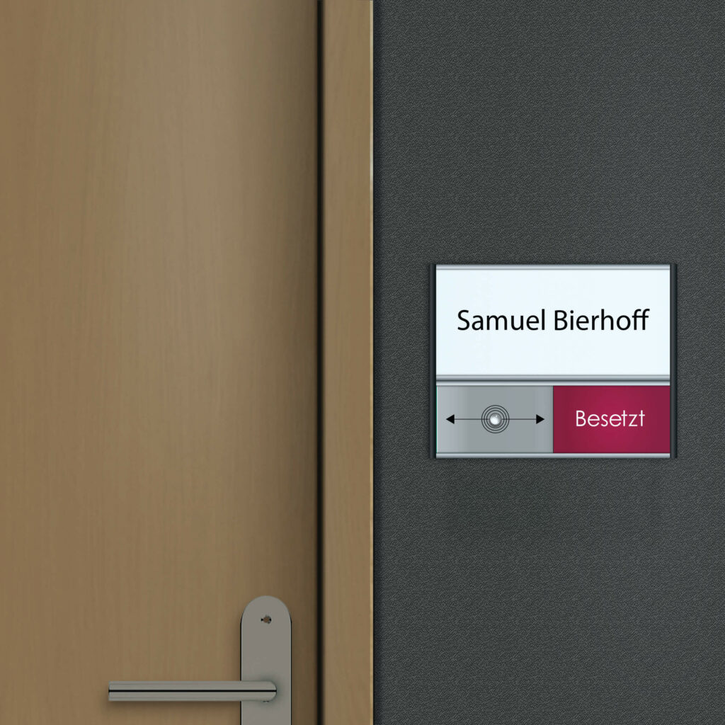 Türschild Büro mit Namen und Funktion Frei/Besetzt. Schreiben Sie den Namen der Person oder die Funktion des Raumes und zeigen Sie dessen Verfügbarkeit an.