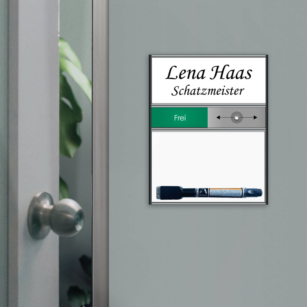 Größe: 150 x 189 mm. Ein Türschild für das Büro mit mehreren Funktionen. Ein Namensschild, ein Frei-/Gebucht-Schild und ein Whiteboard zur Montage an einer Bürotür.