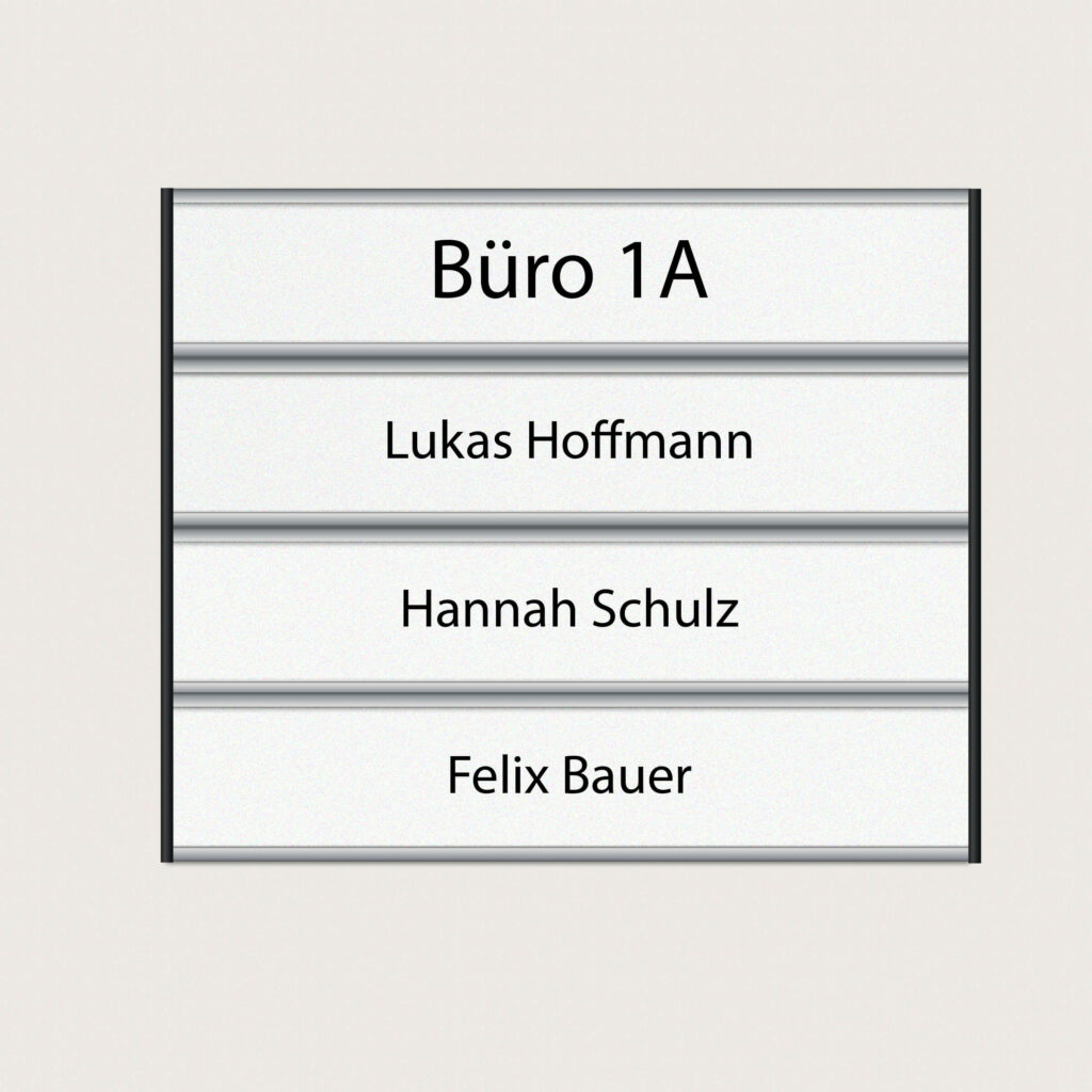 Ein Türschild, das einem Registerbrett ähnelt, 150 x 125 mm groß ist und aus vier Aluminiumprofilen besteht. Ein praktisches Schild, das vor dem Lehrerzimmer angebracht werden kann, um zu sehen, welche Lehrer sich in dem jeweiligen Raum befinden. So können Schüler und Kollegen die gesuchte Person leichter finden. Oder warum nicht vor einem Großraumbüro, um zu sehen, welche verschiedenen Abteilungen jedes Großraumbüro hat? Zum Beispiel: Import, Verkauf, Export, Marketing usw.