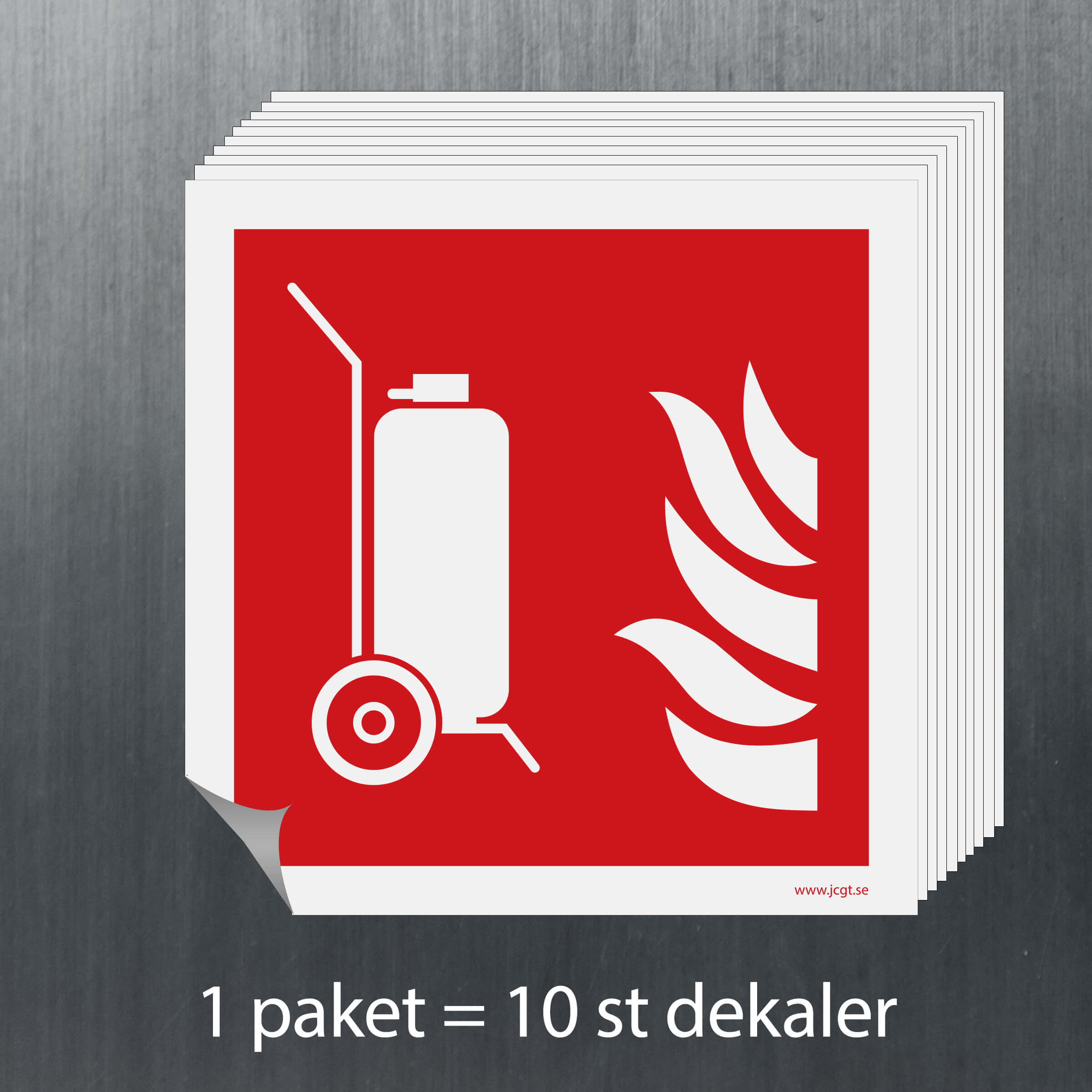Brandskylt Brandsläckare på hjul i olika material och färgegenskaper.