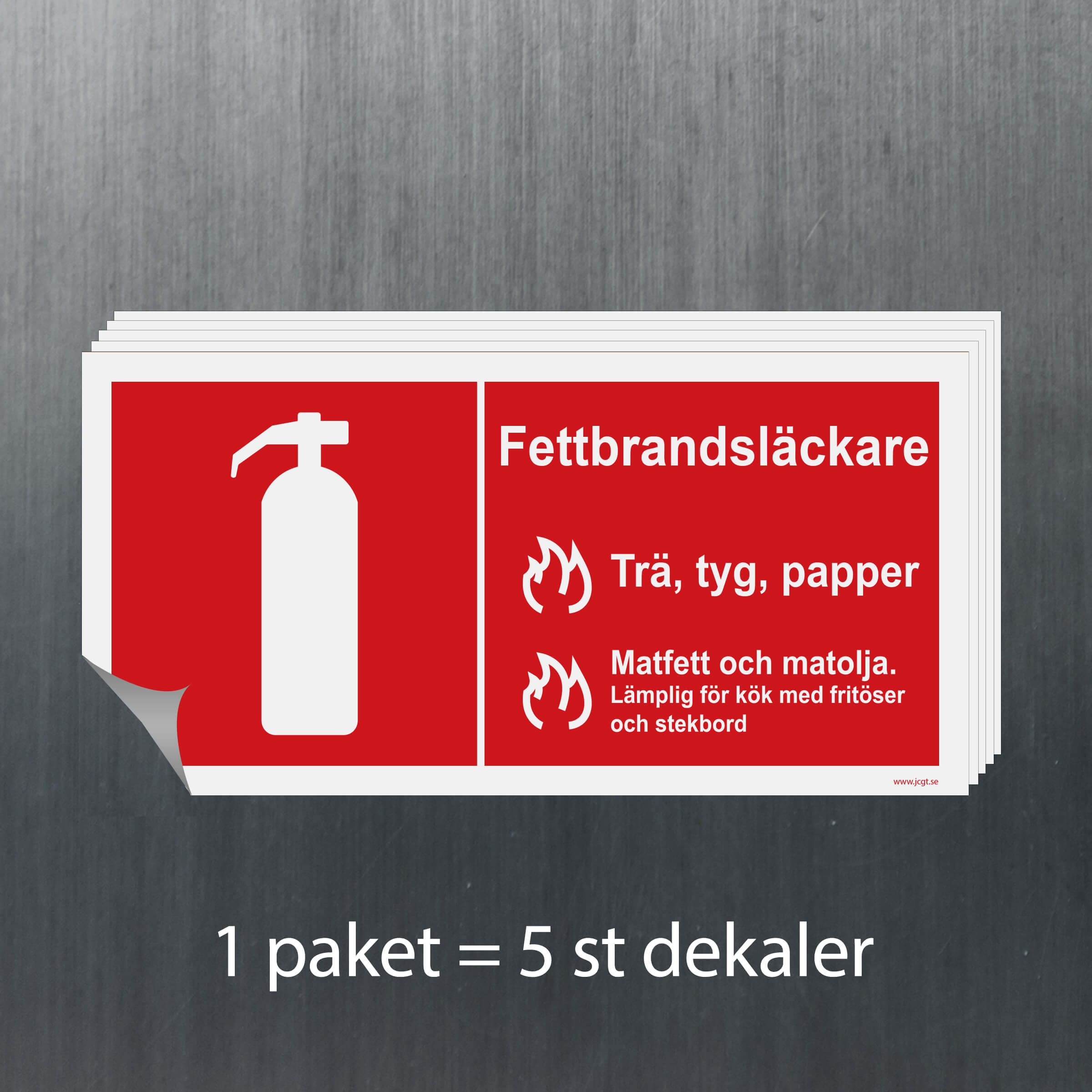 En brandskylt för brandsläckare med fett som finns i olika storlekar och material.