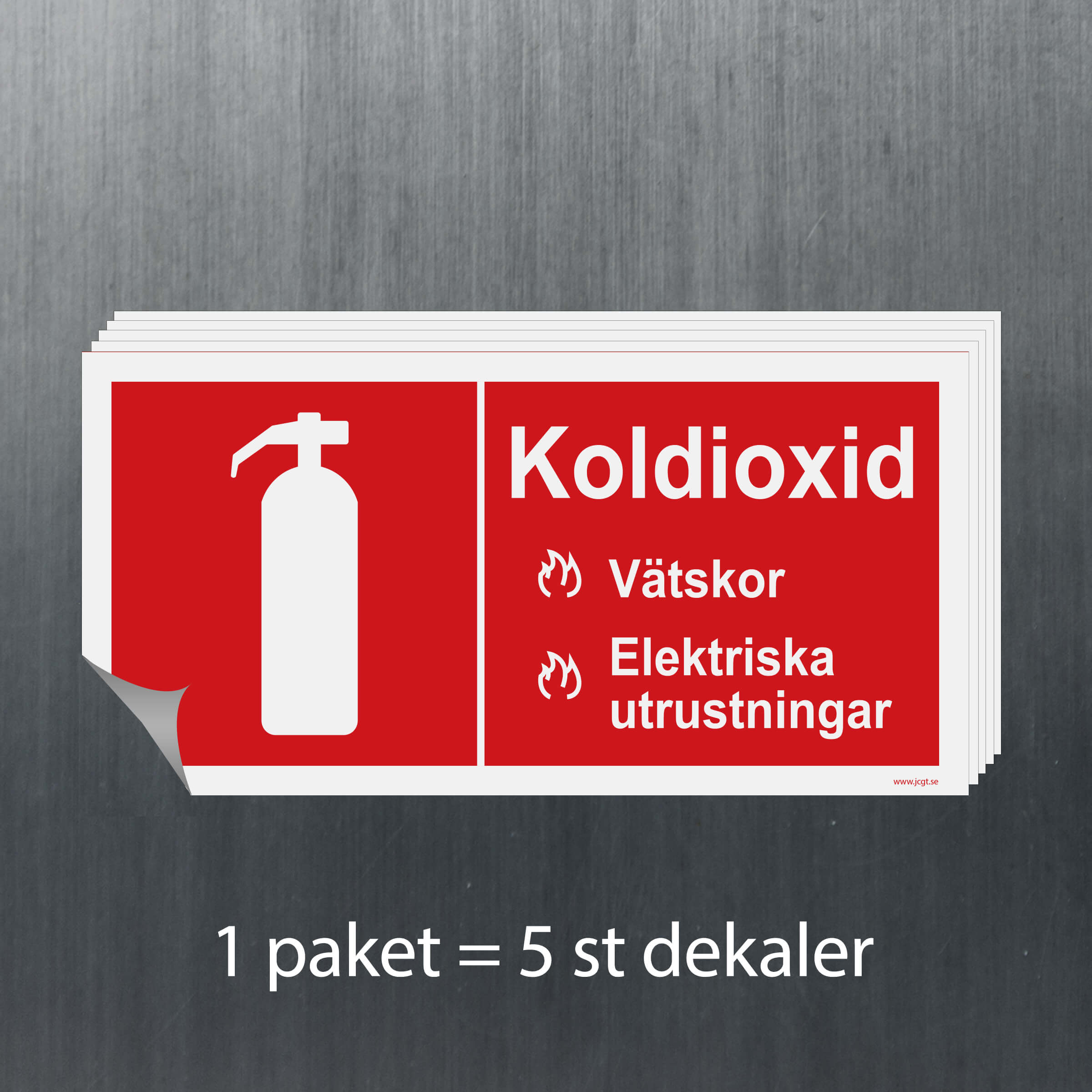 En brandskylt för brandsläckare koldioxid som finns i olika storlekar och material.
