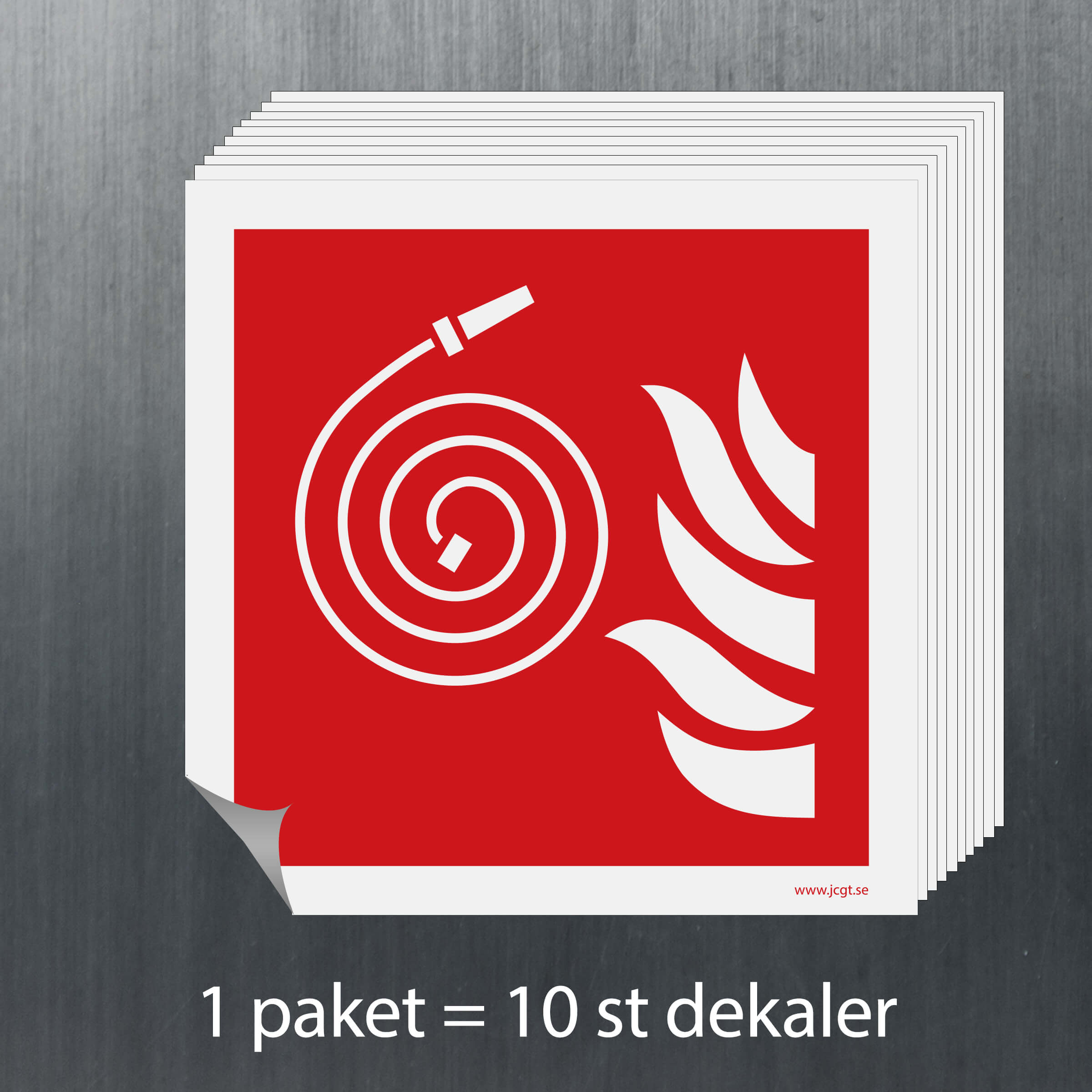 Brandskylt Okopplad brandslang i olika material och färgegenskaper.