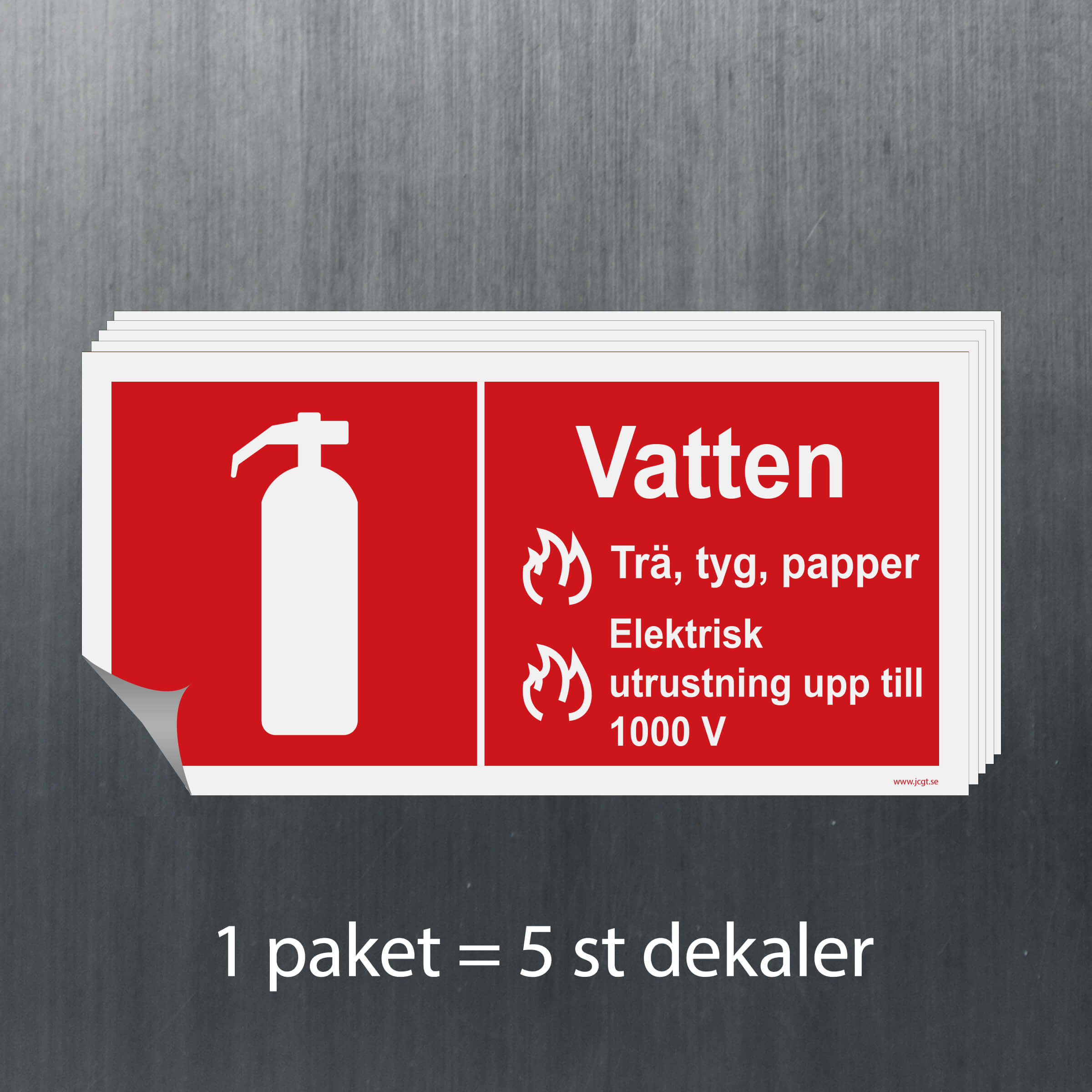 En brandskylt för brandsläckare vatten som finns i olika storlekar och material.