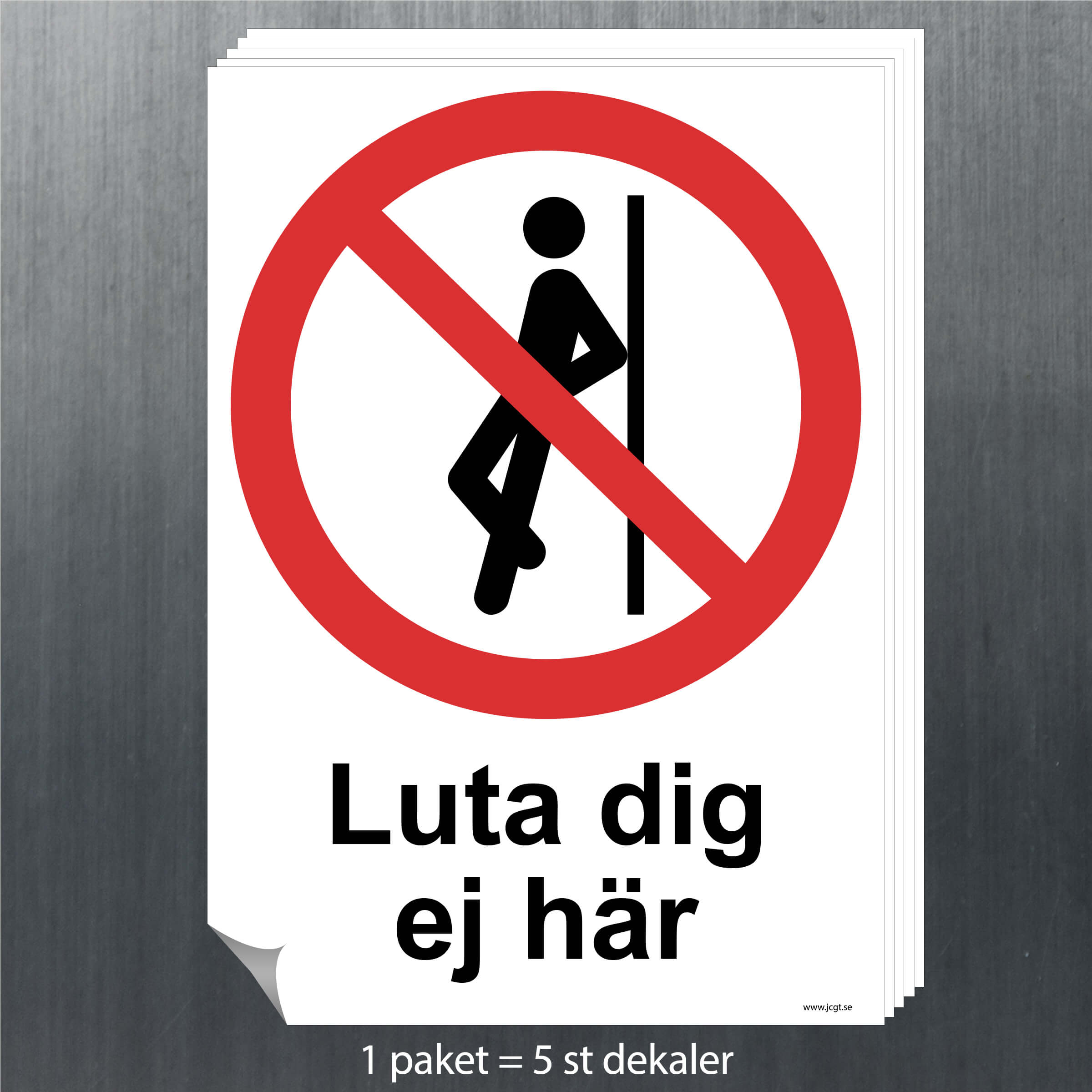 Förbudsskylt Luta dig ej här att sätta vid arbetsplatsen. Välj mellan olika storlekar och material som aluminium eller klisterdekal.