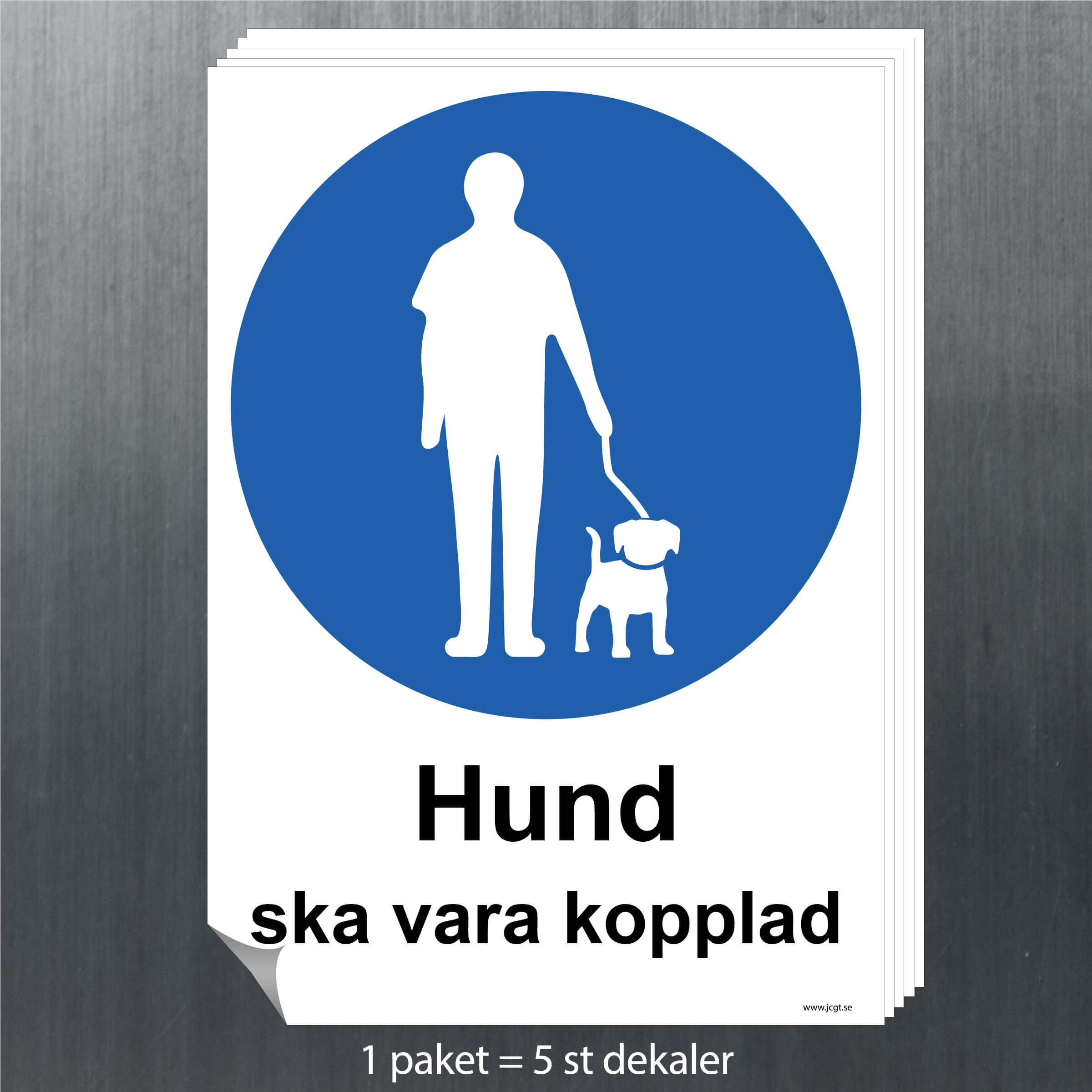 Påbudsskylt Hund ska vara kopplad som visar vilka krav som finns på denna plats.