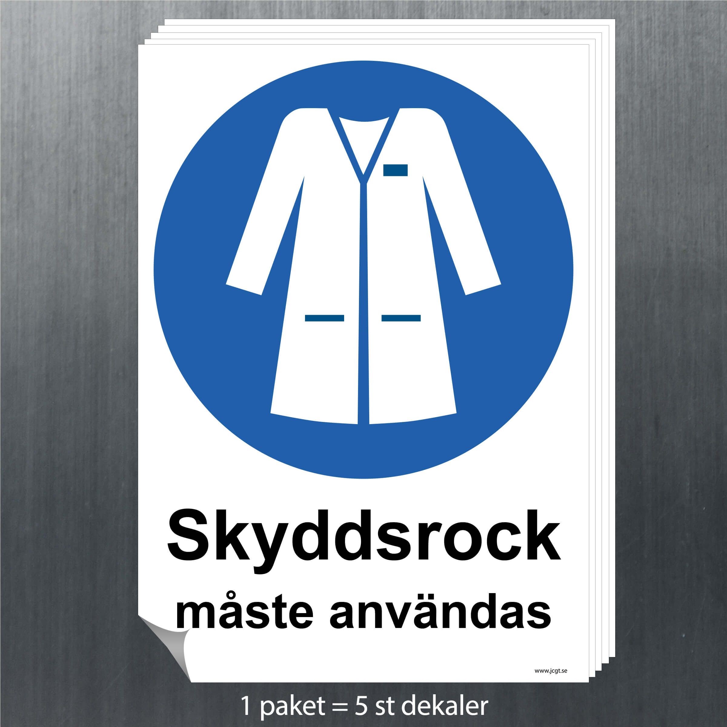 Påbudsskylt Skyddsrock som visar vilka krav på arbetskläder som finns på arbetsplatsen.