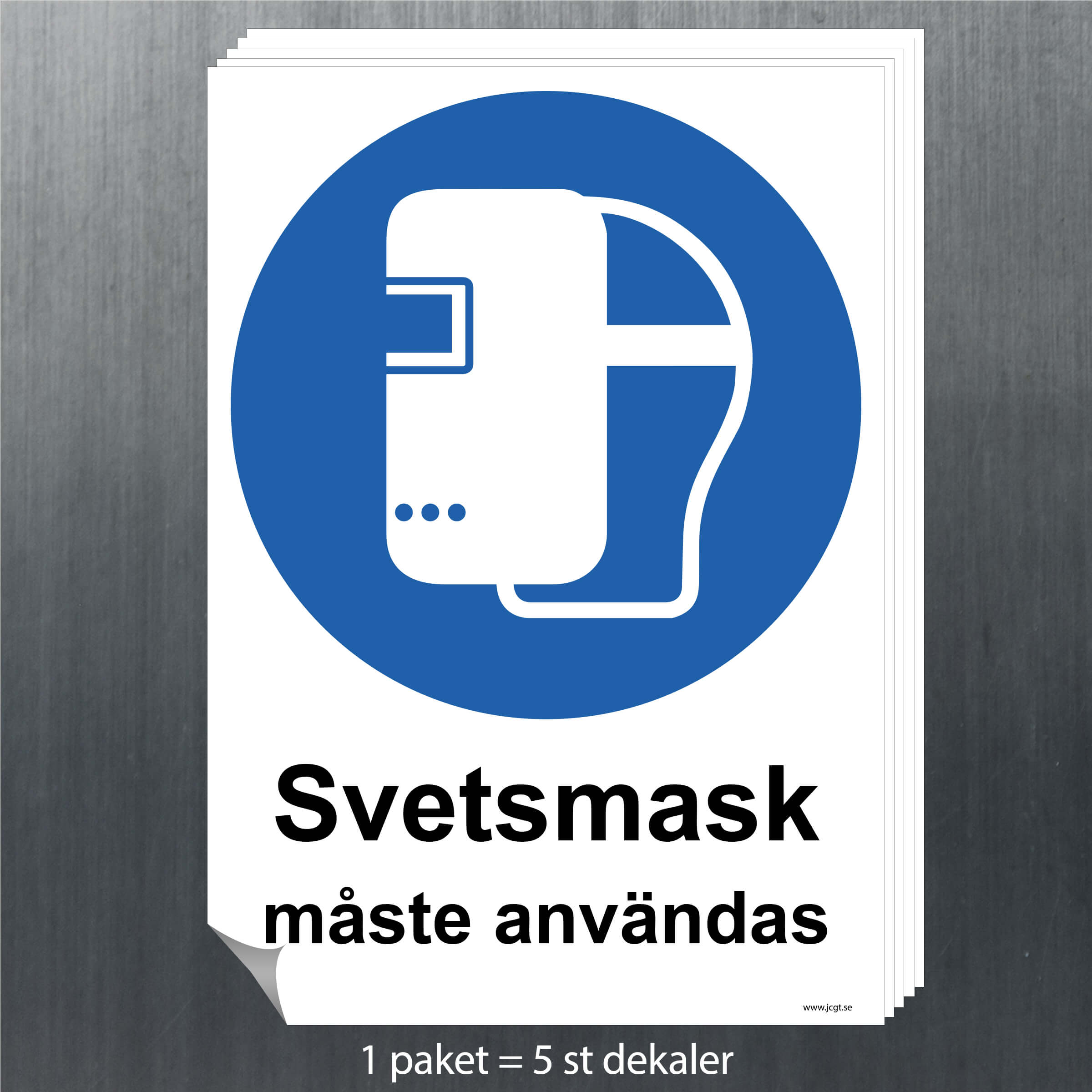 Påbudsskylt Svetsmask som visar vilka krav på arbetsutrustning som finns på denna arbetsplats.