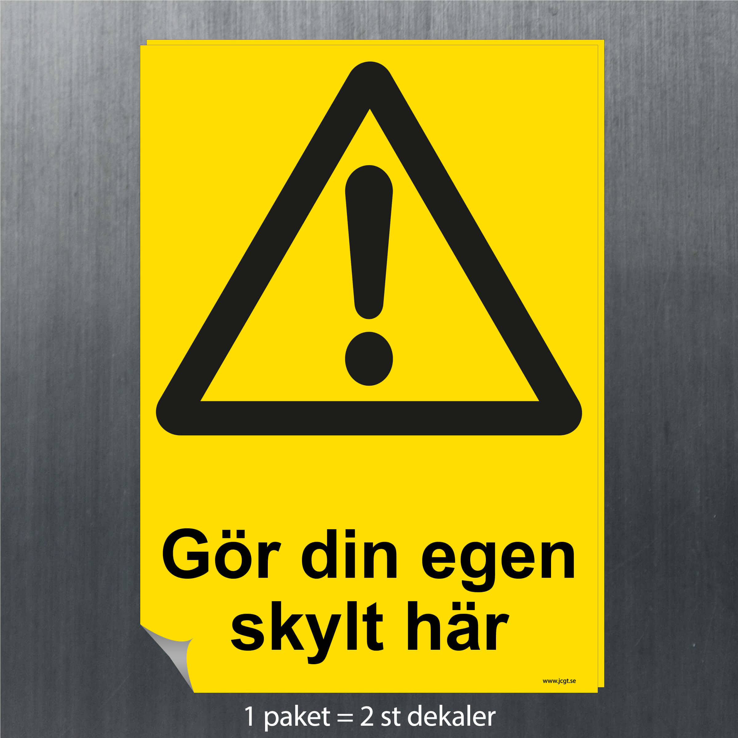 En varningsskylt där ni själva kan välja symbol och text och på så sätt skapa en unik skylt/dekal.