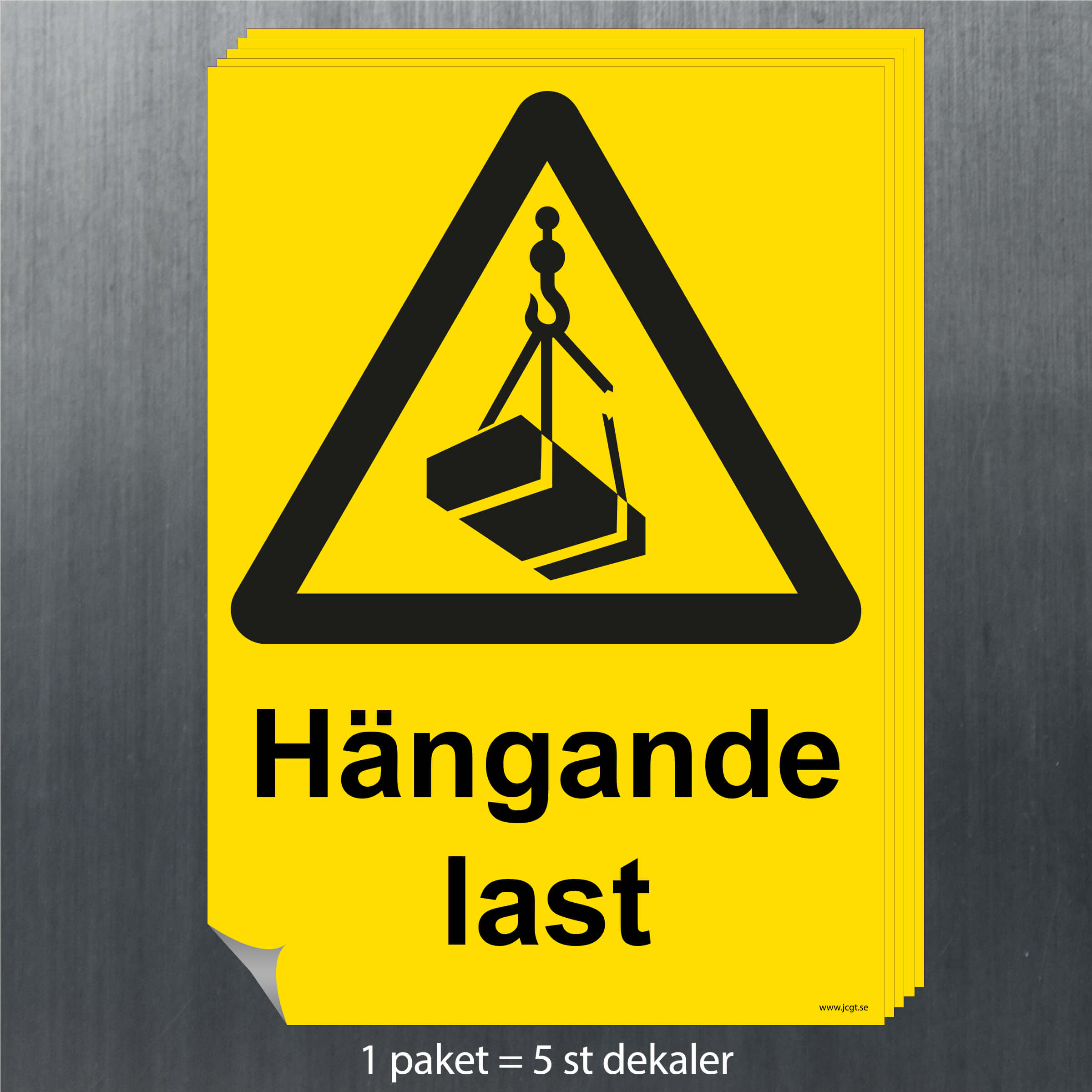 Varningsskylt Hängde last, som uppmärksammar de som befinner sig på platsen om risker som finns där.