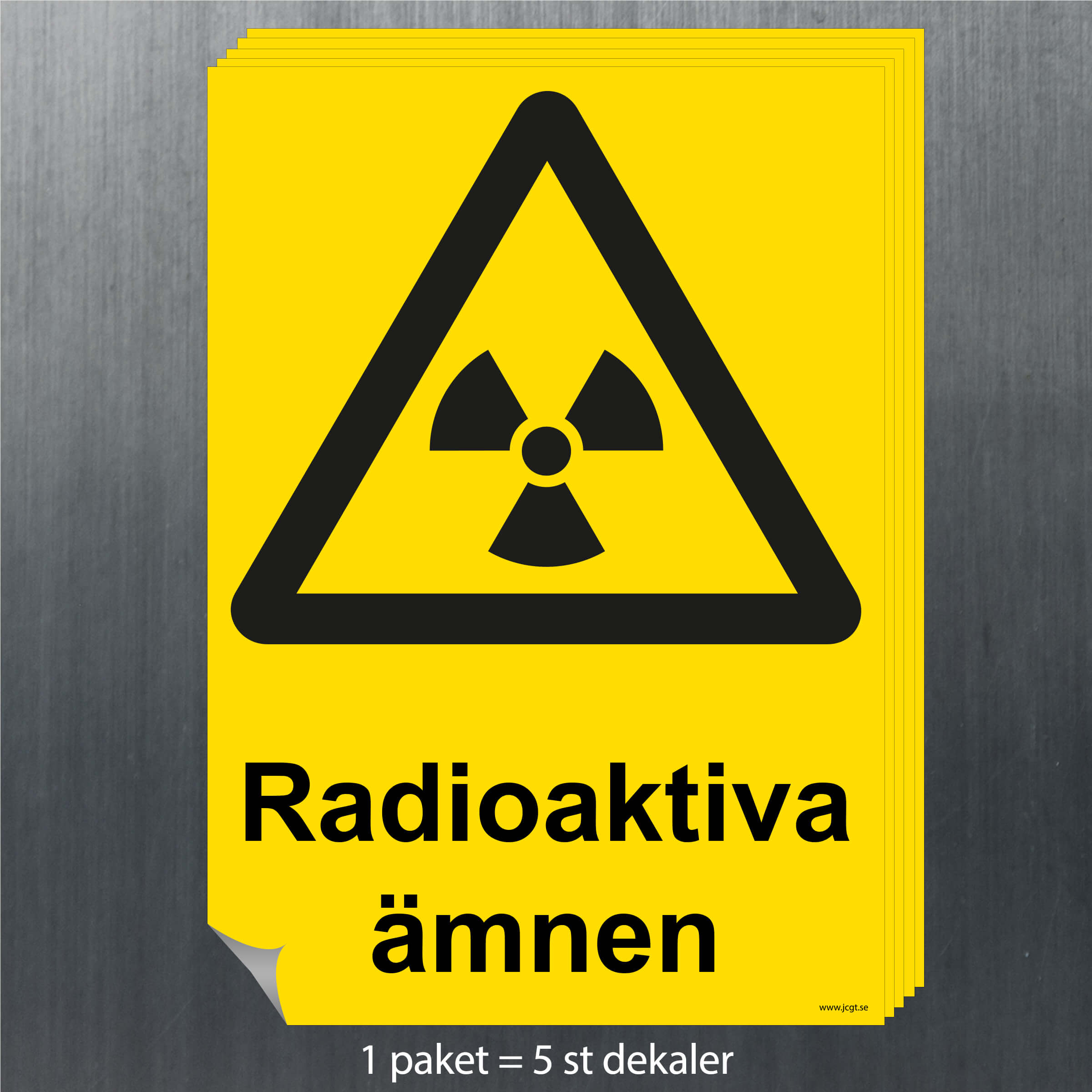 Varningsskylt Radioaktiva ämnen, som uppmärksammar de som befinner sig på platsen om risker som finns där.