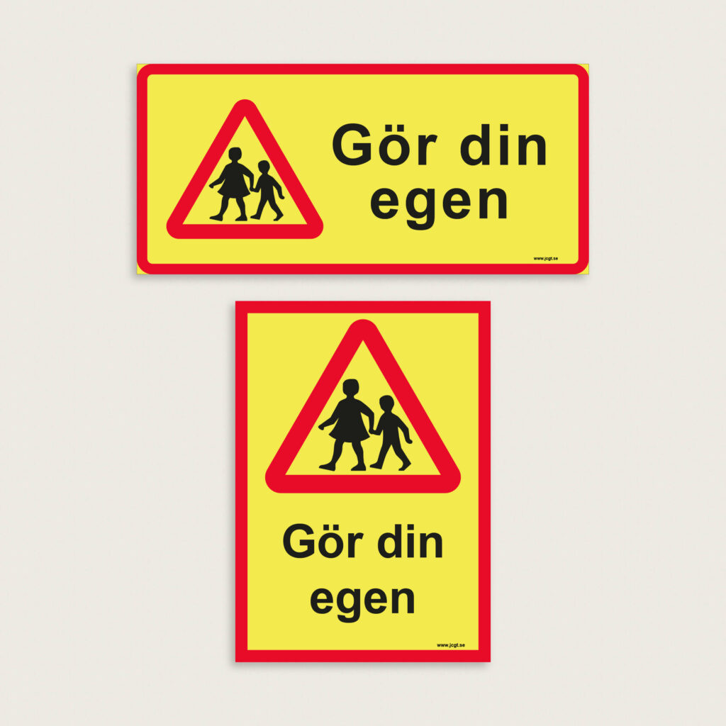 Lekande barn skylt Gör din egen. Välj storlek, material och skriv in din text och skap en unik skylt.