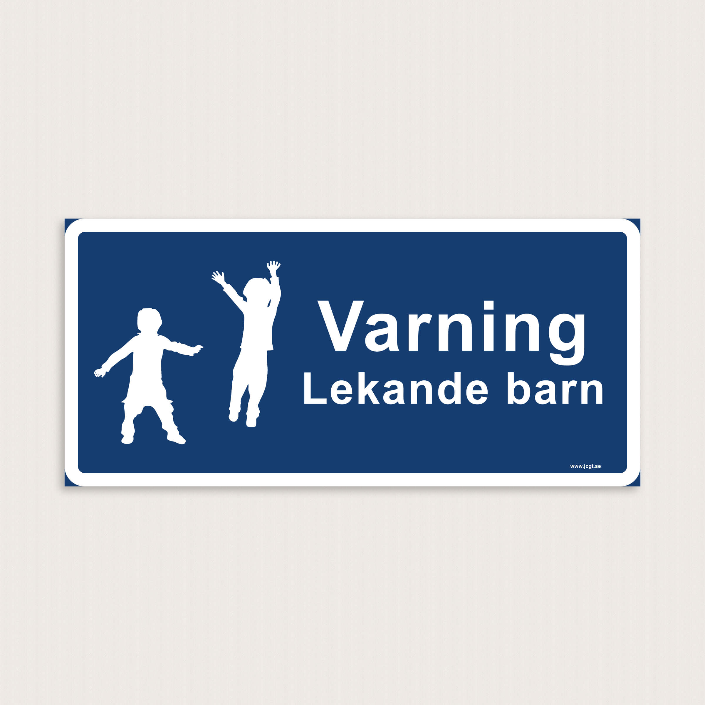 Varning Lekande barn skylt i storleken 430 x 200 mm. Monteras med skruv, tejp eller på stolpe.