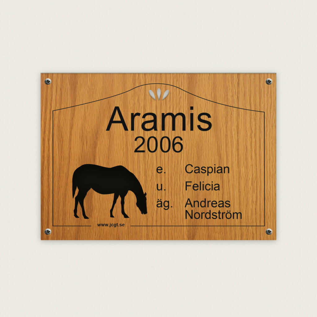 Boxskylt i trä med motivet av en ätande häst. Välj text och typsnitt.