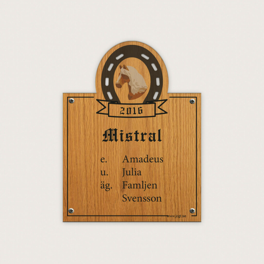 Skriv själva in den text ni önskar men vi brukar använde oss av följande information. Hästens Namn, Hästens födelseår. Sedan skriver man in faderns namn, E (som står för Efter), moderns namn U (som står för Undan) och till sist ägarens namn, ÄG.