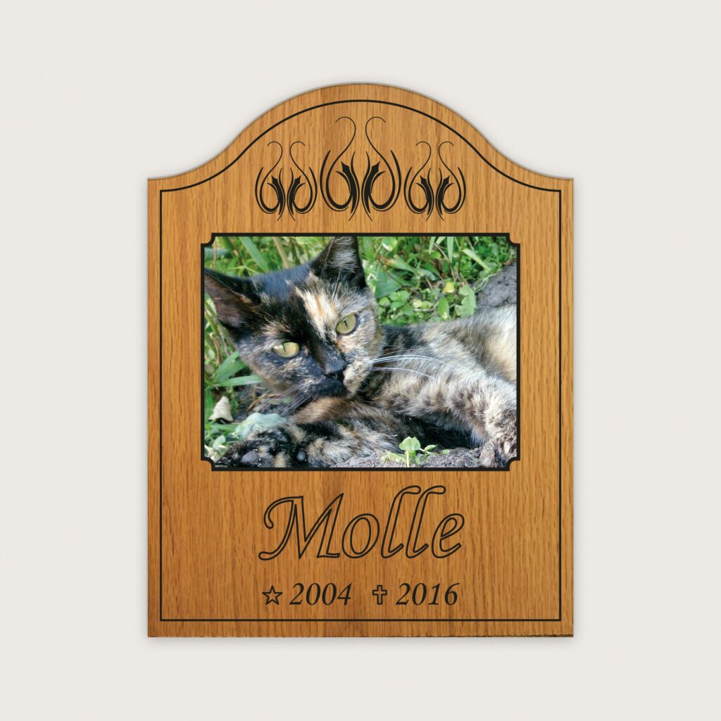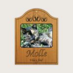 En minnesskylt i trä med valfri bild på ert husdjur och valfri text i ett stående format.