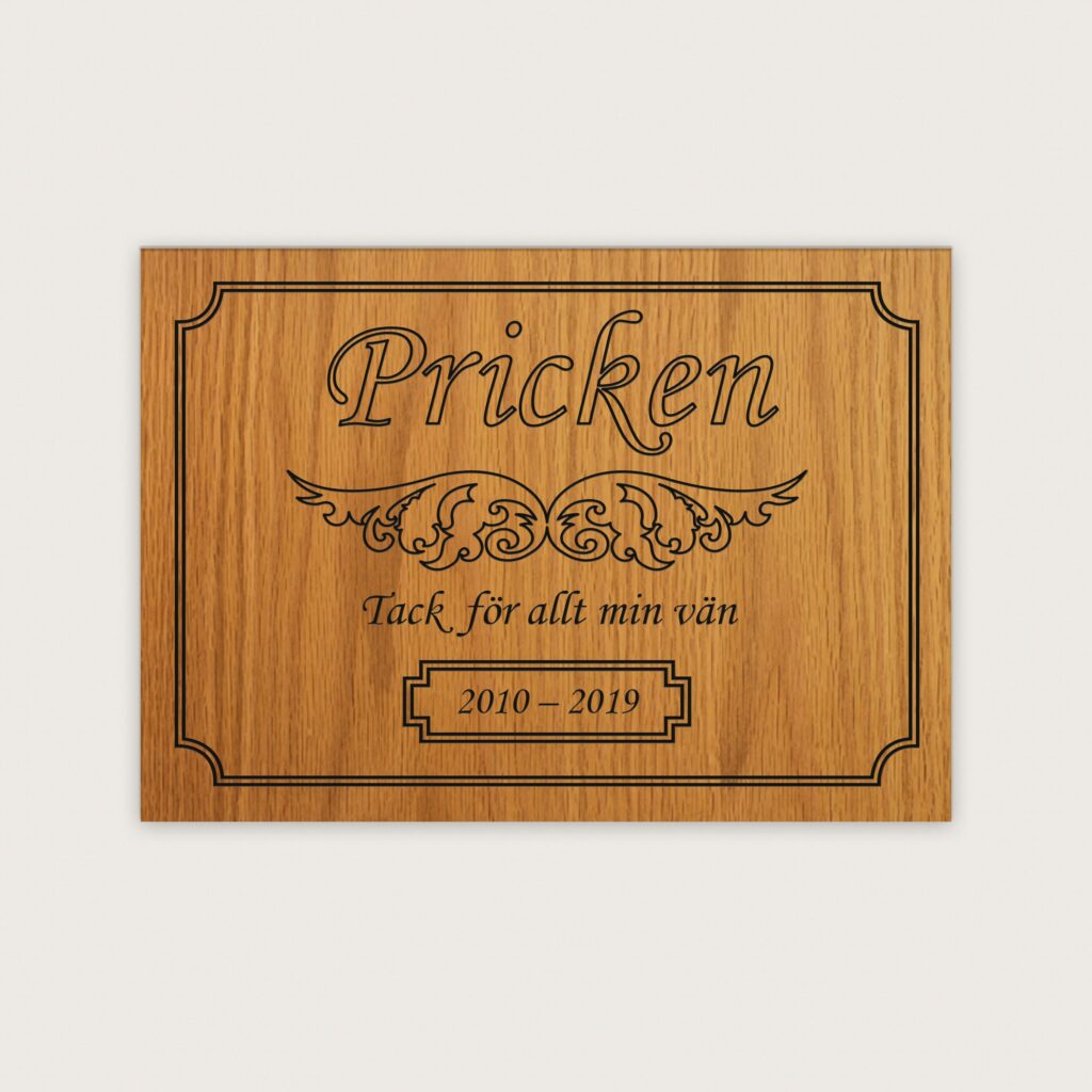 Träet är 3,2 mm tjockt av Hardwood Ek och är lackerad så den passar för både inom- och utomhusbruk. Denna fina minnesskylt har ett vackert vingmotiv som smyckar ut skylten. Välj den text och det typsnittet ni vill ha för att göra den personlig och anpassad efter er vän.