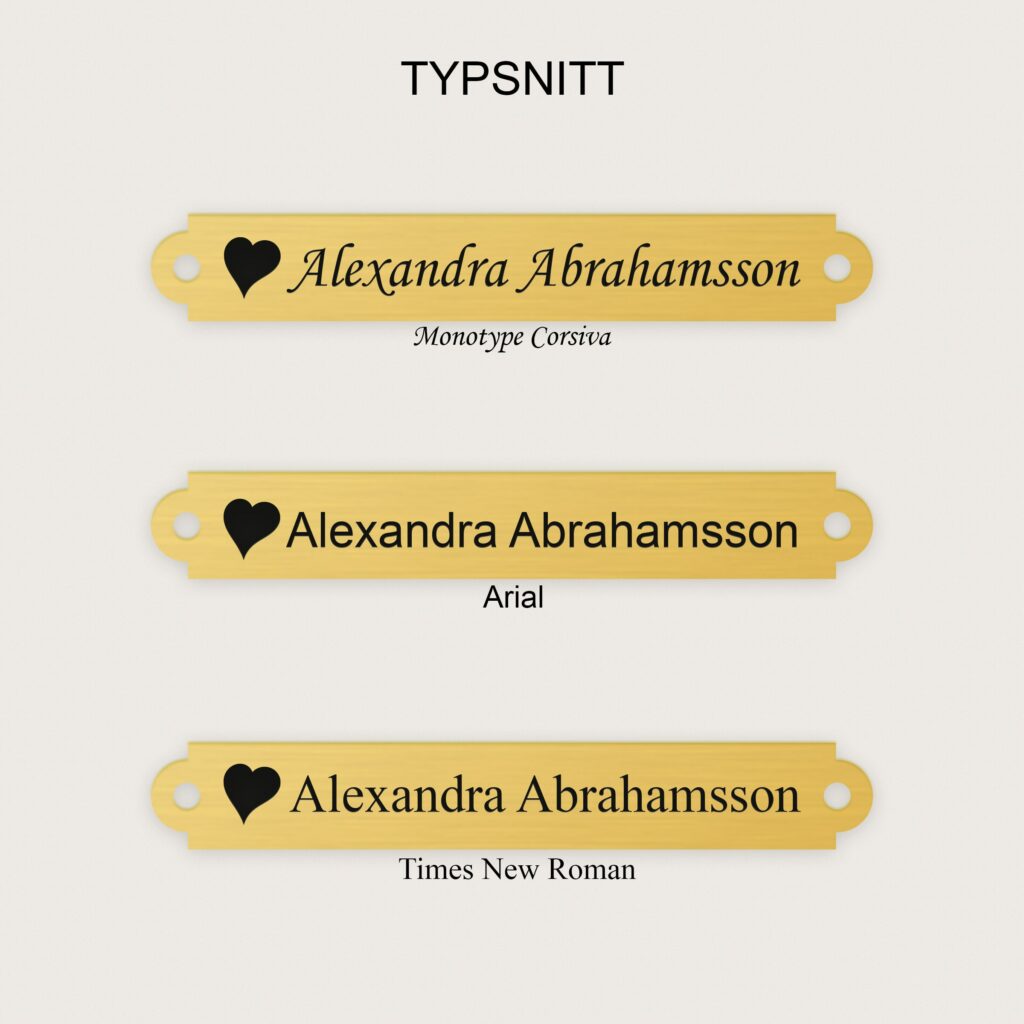 Skyltarna är tillverkade i 0,5 mm tjock mässing, vilket gör dem både hållbara och flexibla. De flesta skyltarna graveras och fylls svart färg, men eftersom gravyr är ett hantverk kan det förekomma undantag. Vid längre text eller små tecken trycks istället texten med UV-print för att uppnå bästa resultat och synlighet. Skyltarna levereras med två hål. Ett exklusivt och informativt sätt att märka upp sina saker vilket gör det enkelt att identifiera om de skulle komma bort.