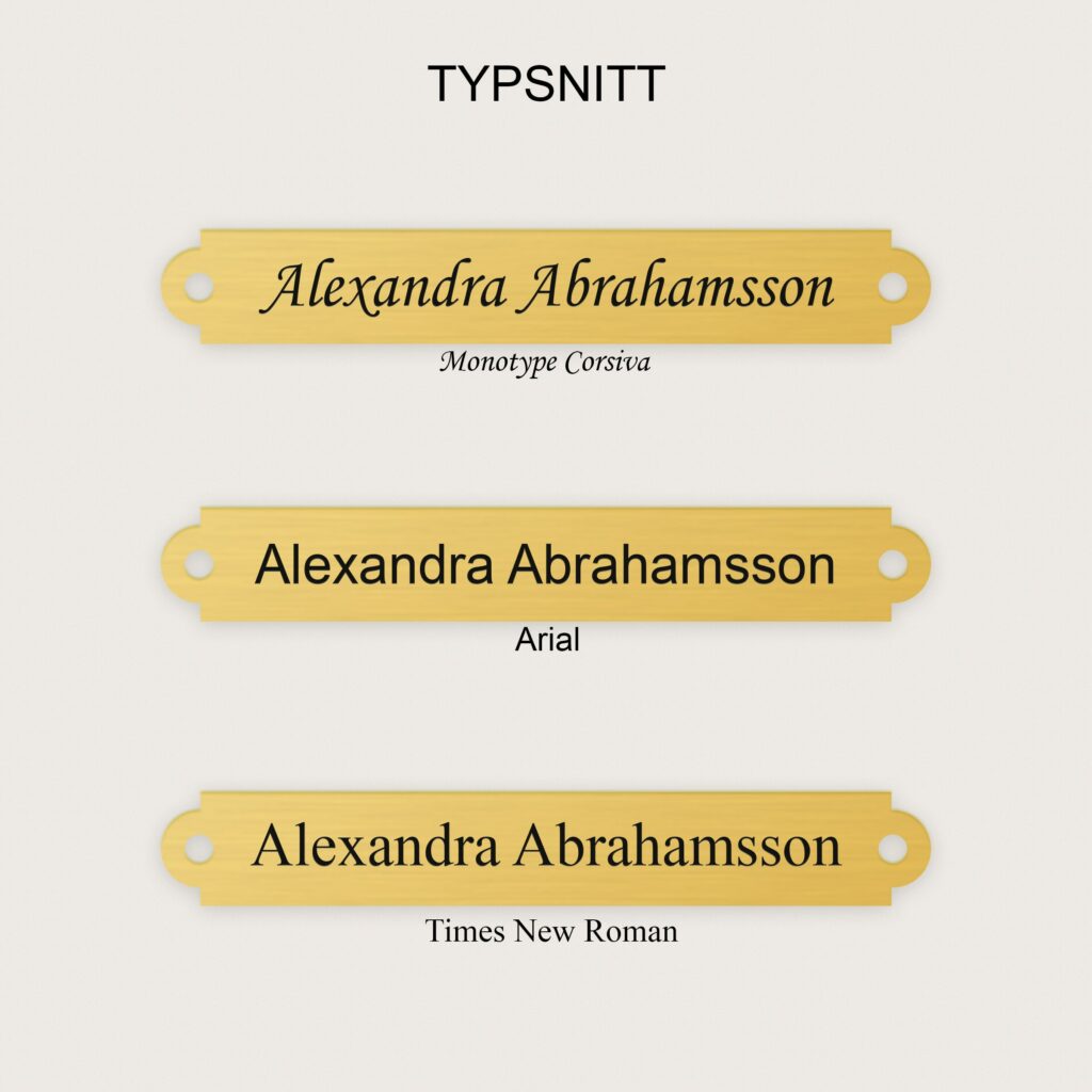 Skyltarna är tillverkade i 0,5 mm tjock mässing, vilket gör dem både hållbara och flexibla. De flesta skyltarna graveras och fylls svart färg, men eftersom gravyr är ett hantverk kan det förekomma undantag. Vid längre text eller små tecken trycks istället texten med UV-print för att uppnå bästa resultat och synlighet. Skyltarna levereras med två hål. Ett exklusivt och informativt sätt att märka upp sina saker vilket gör det enkelt att identifiera om de skulle komma bort.