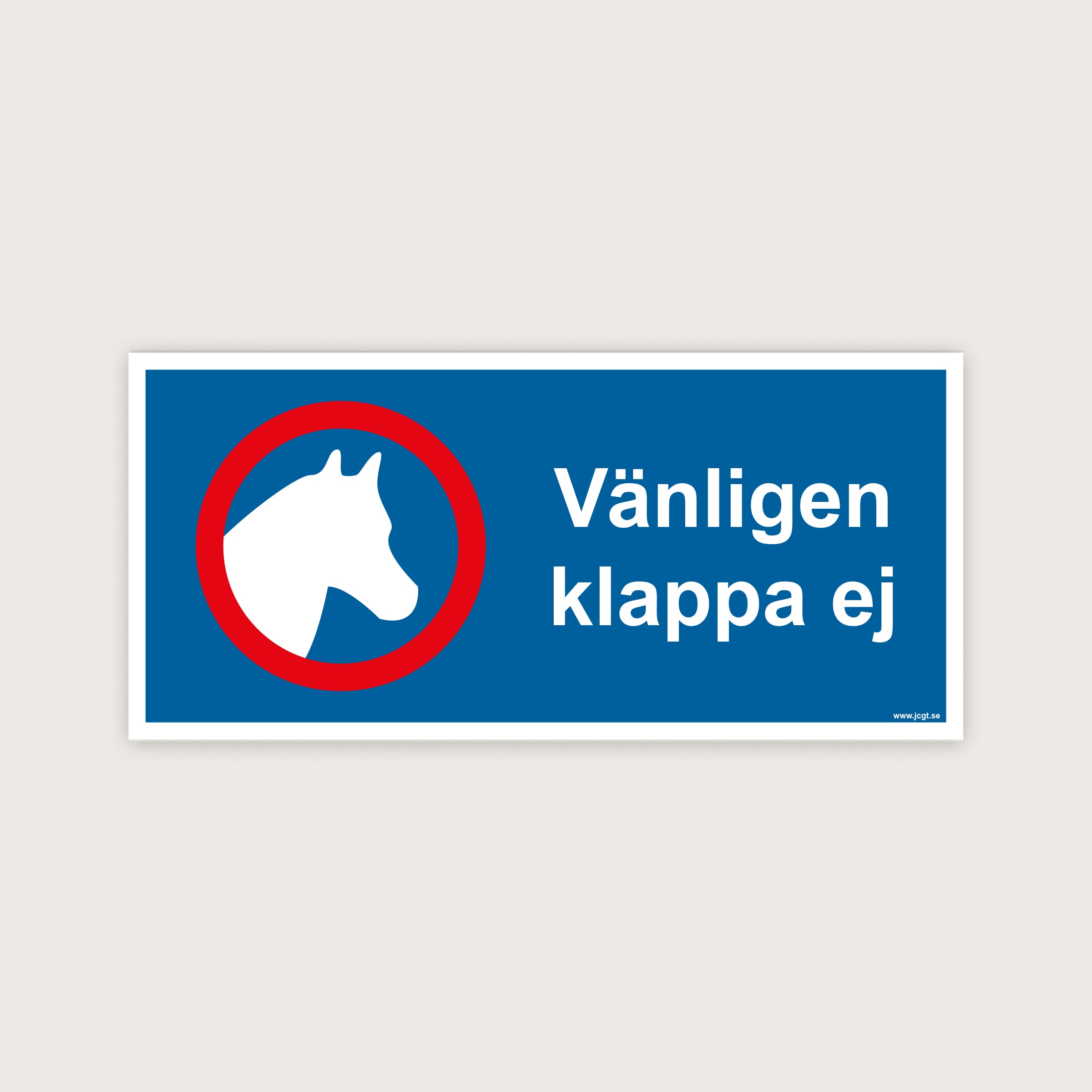 Upplever ni att människor olovligen klappar era hästar eller finns det en risk att stressa hästarna när man klappar dem? Då är en varningsskylt med texten Vänligen klappa ej ett bra redskap. En stressad häst kan orsaka faror både för hästen själv och människorna i omgivningen, vilket bör undvikas så gott som möjligt.