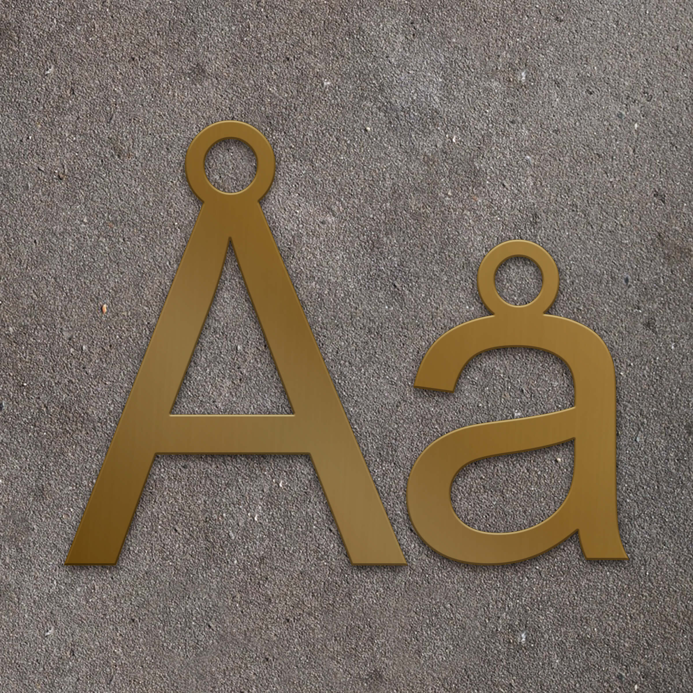 Fasadbokstav Å i 2 mm mässing för inom- och utomhusbruk.