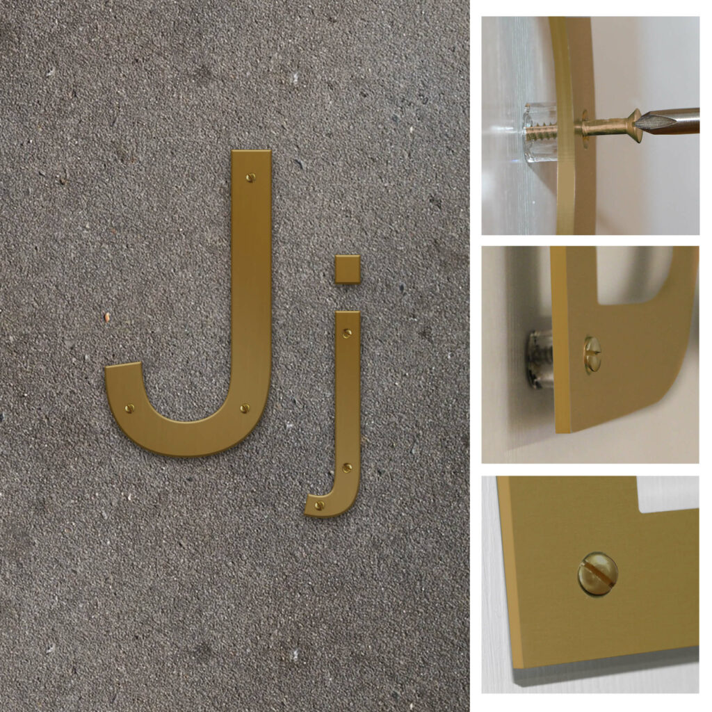 Fasadbokstav J i 2 mm mässing för inom- och utomhusbruk.