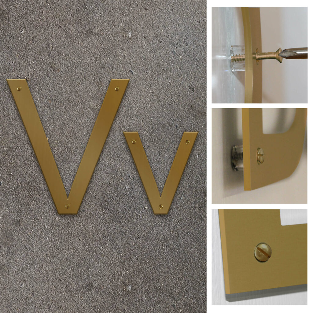 Fasadbokstav V i 2 mm mässing för inom- och utomhusbruk.