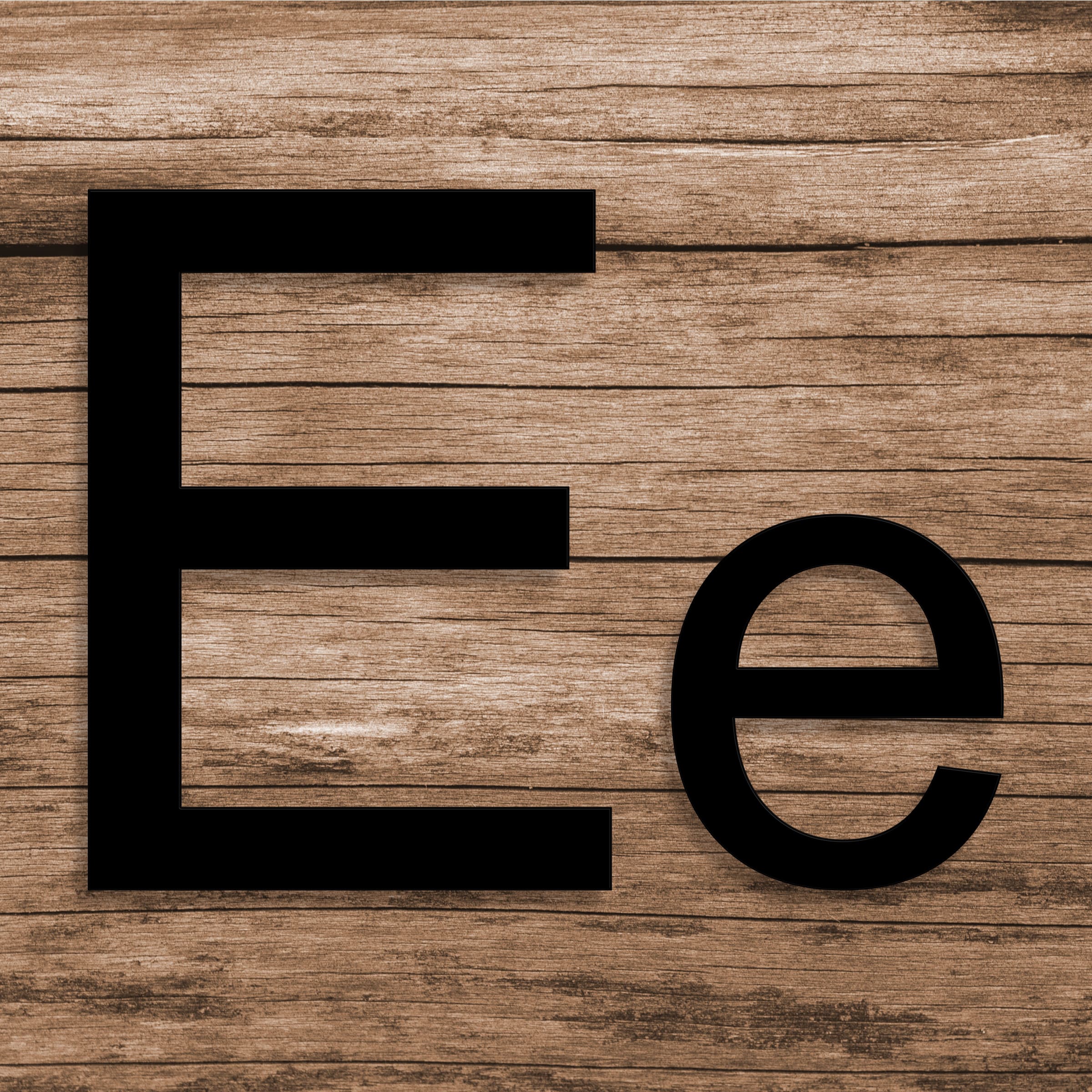 Fasadbokstav E i antingen svart eller vit plexiglas som monteras med dolda distanser.