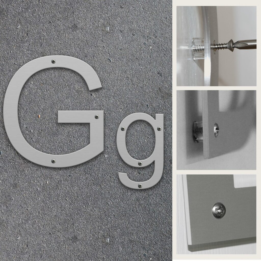 Fasadbokstav G i 3 mm aluminium för inom- och utomhusbruk.