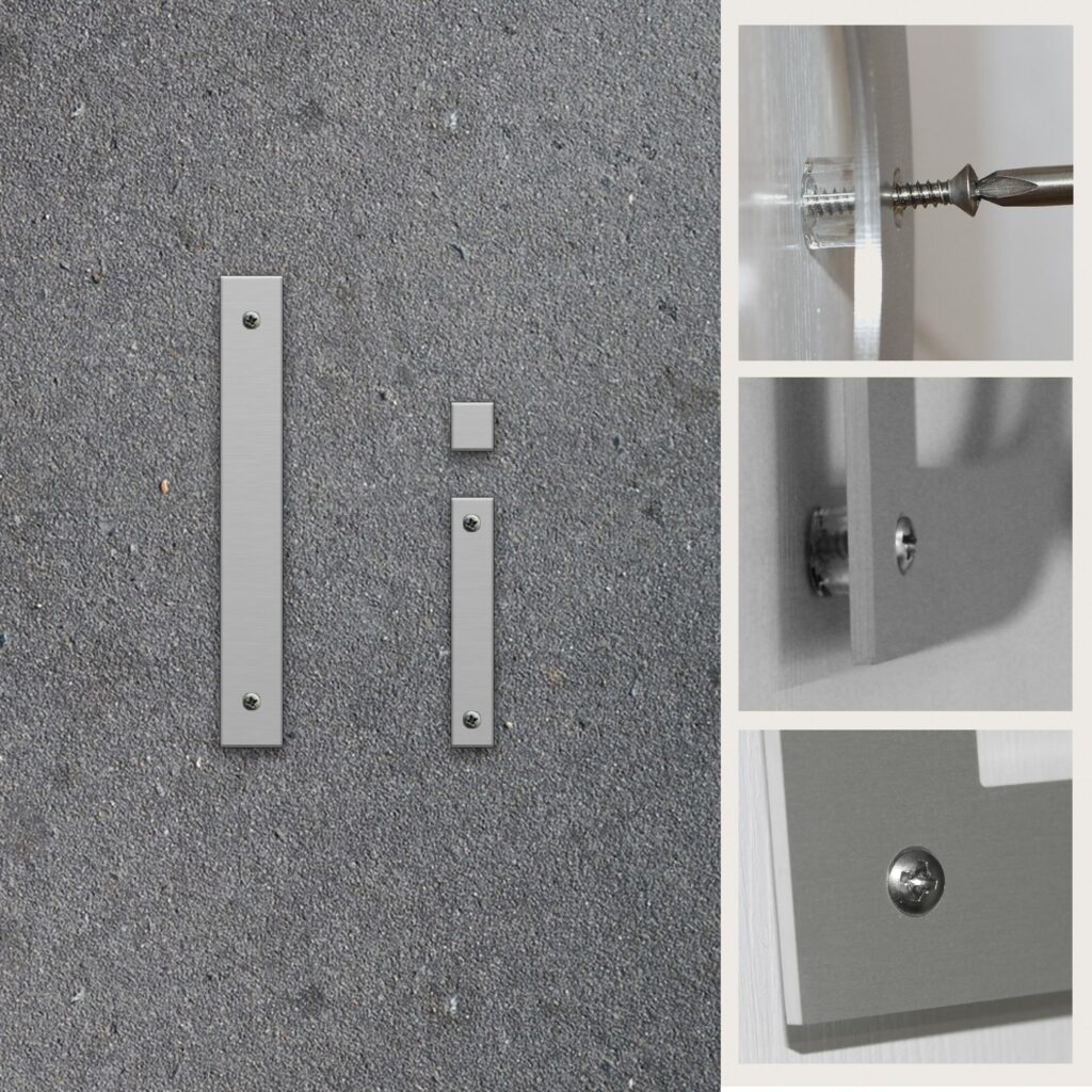 2. Distans med dold montering: Använd den medföljande monteringsmallen och förborra hålen där dekoren ska sitta. Det är viktigt att ni utgår från hålmarkeringarna i mallen då de stämmer överens med avstånden på stiften som sitter bakom dekoren. Använd med fördel fogmassa / silikon i hålen om ni exempelvis borrar i betong. Trä sedan på plexidistanserna och tryck sedan dit dekoren.