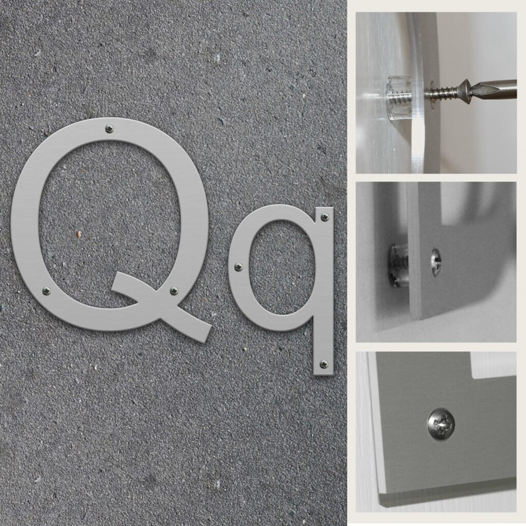 Fasadbokstav Q i 3 mm aluminium för inom- och utomhusbruk.