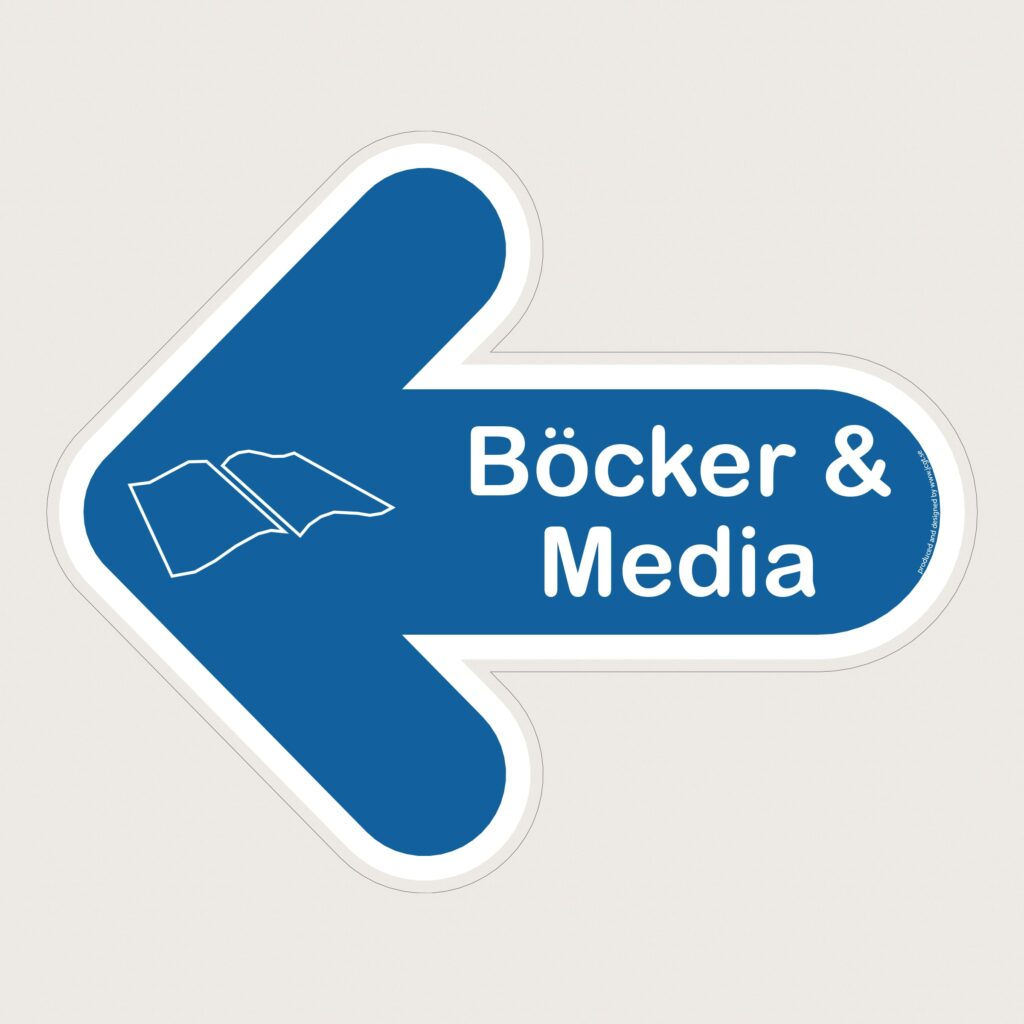 En golvpil med text och symbol för Böcker och Media. Pekar era kunder rätt.