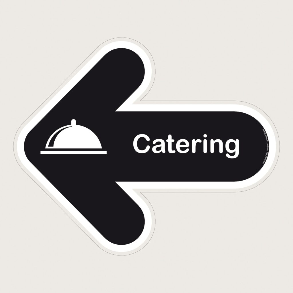 En golvpil med text och symbol för Catering. Pekar era kunder rätt.