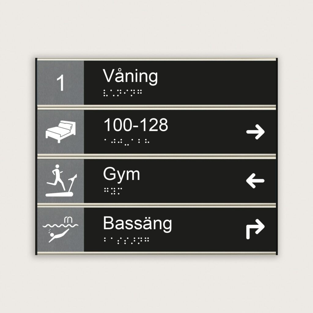 En väggskylt är bra alternativ som hänvisningsskylt. Den syns tydligt på ett kortare avstånd och den är enkel att anpassa. Skyltsystemet är mycket flexibelt då varje del är separat fristående och går att koppla loss från tavlan. Vilket medför att det är enklare för beställaren att byta sektioner om så skulle behövas.