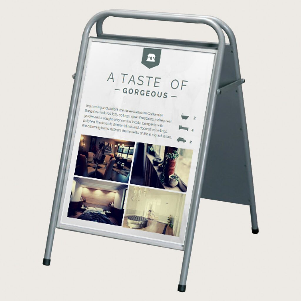 Ett enkelt och effektivt A-Ställ försett med en frontplast med magnet som skapar en bra och säker inramning för ditt motiv. Stället är tillverkat i 1,25 mm stålplåt samt 25 mm pulverlackade stålrör. Finns i att få färgerna vit, röd, svart och silver.