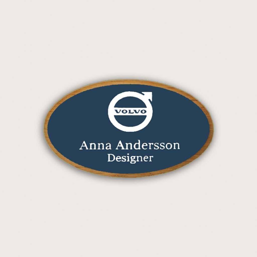 Namnskylt Oval i Trä / Plast 61 x 36 mm som snyggt pryder er blus eller skjorta