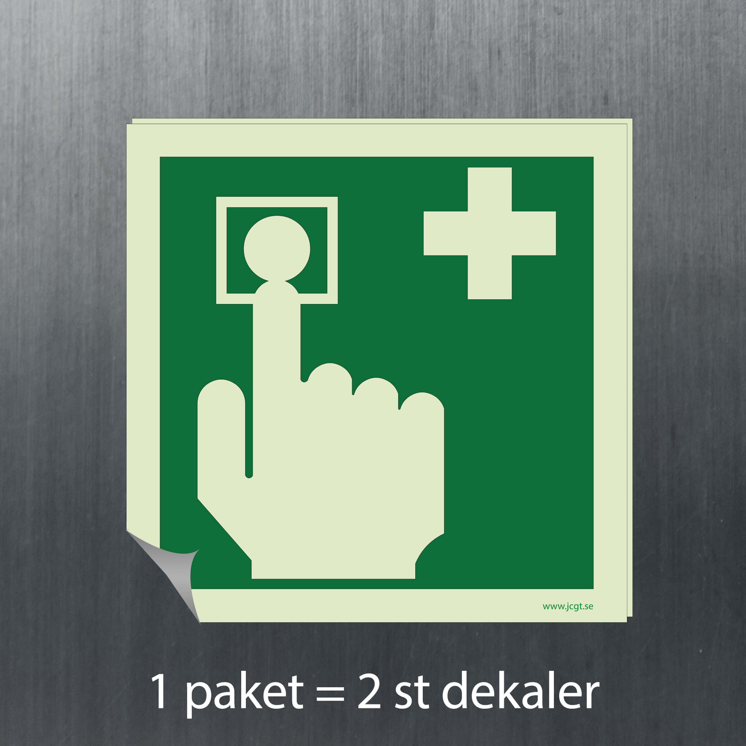 En Första hjälpen skylt för Larmknapp som med sin efterlysande färg syns bra i mörker.