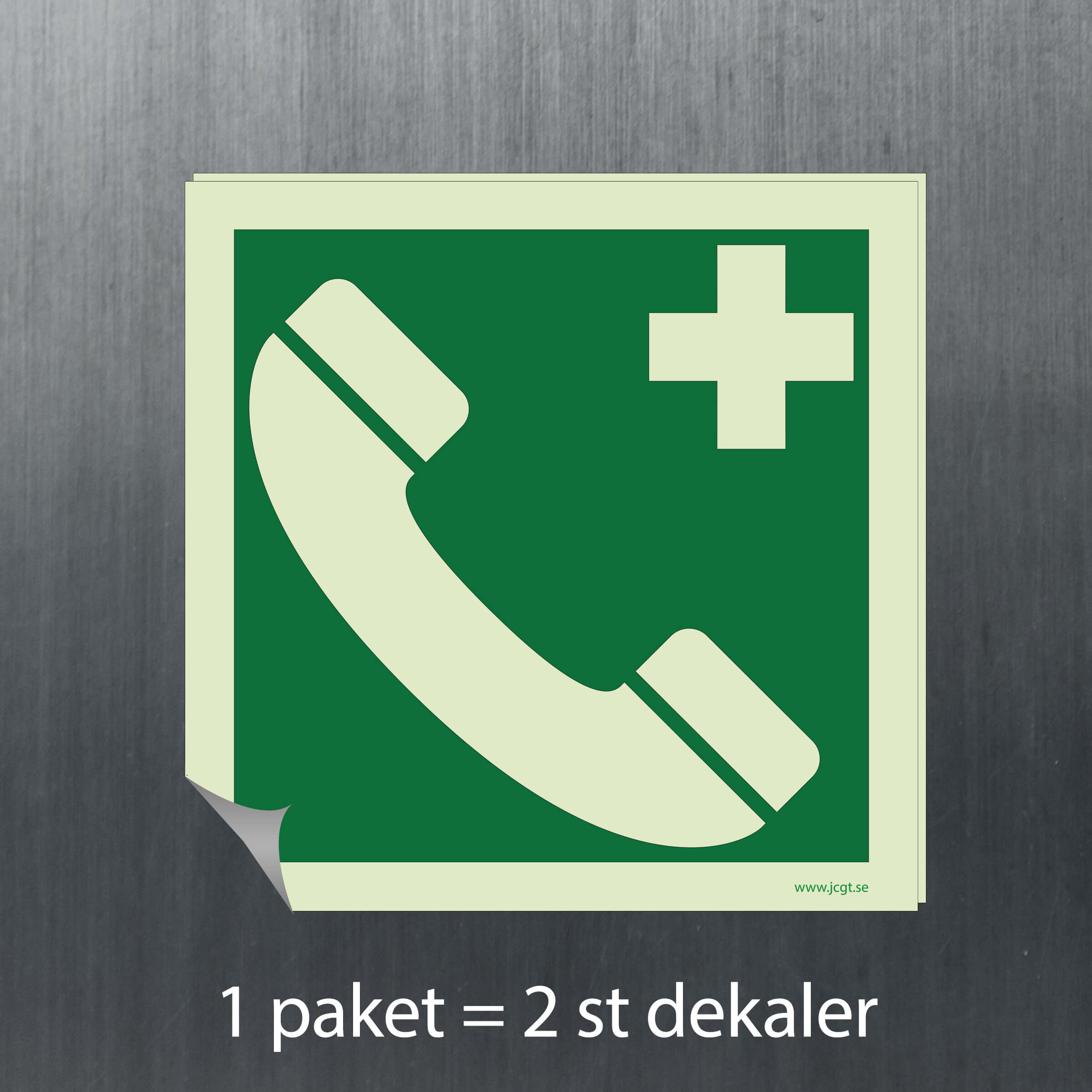 En Första hjälpen skylt för Nödtelefon som med sin efterlysande färg syns bra i mörker.