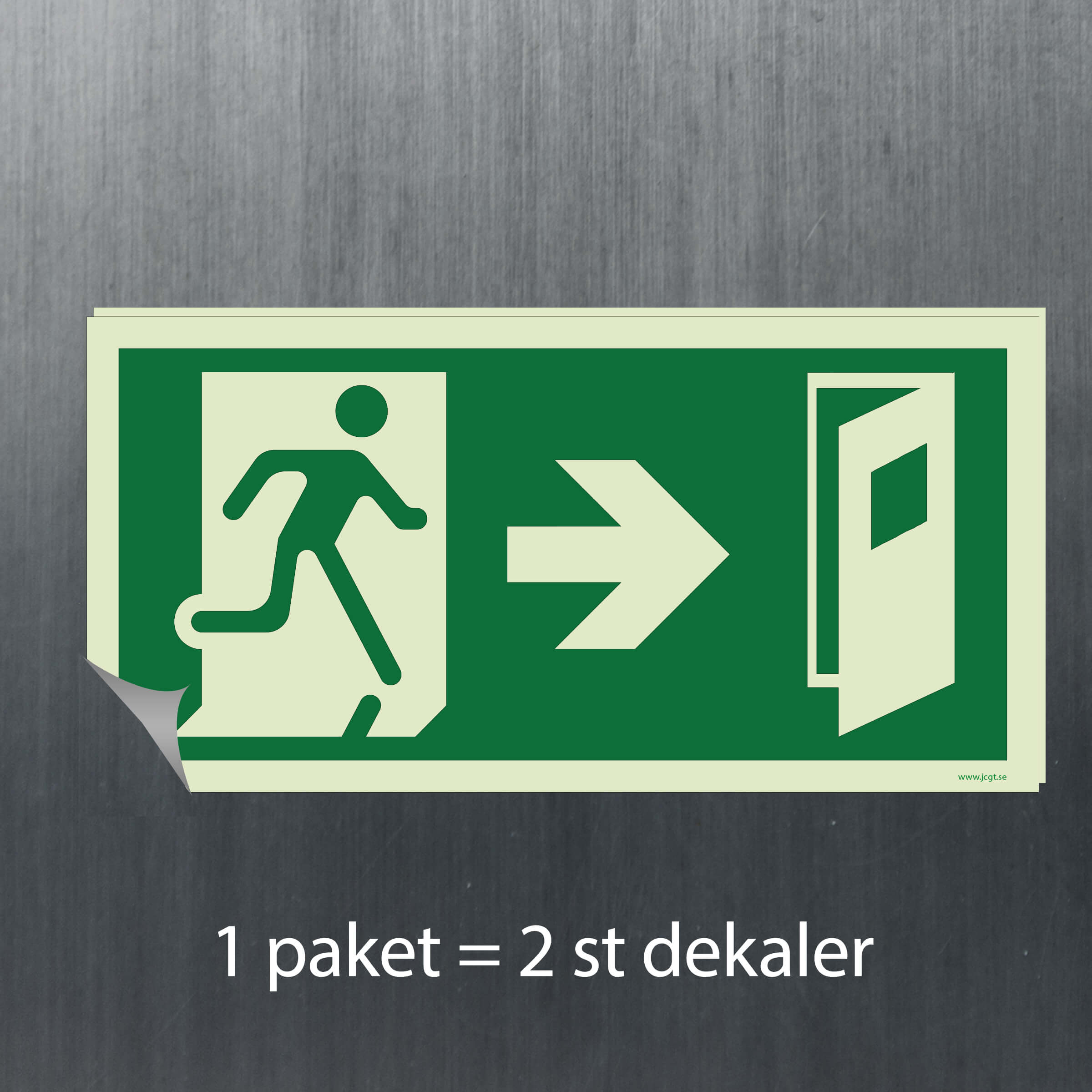 En Utrymningsskylt Dörr till höger som pekar ut vägen till den närmsta nödutgången.