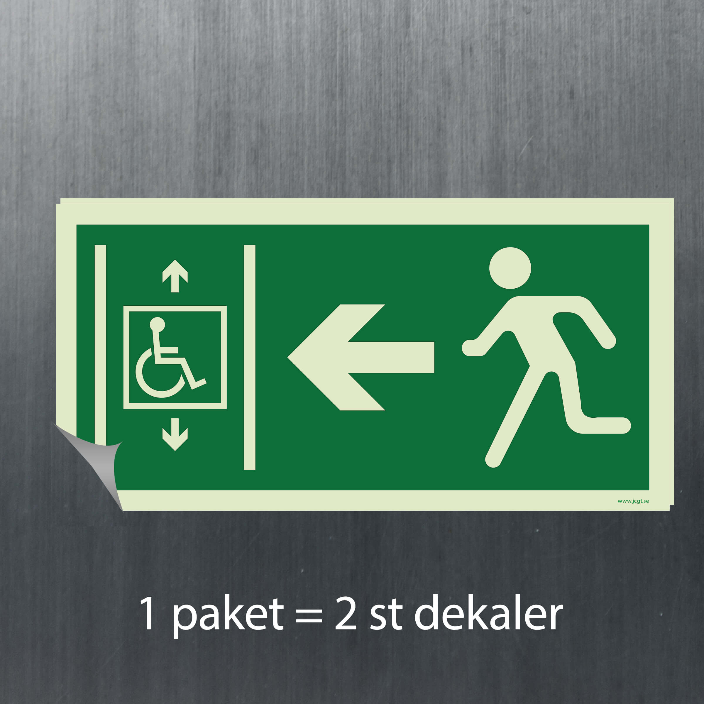 En efterlysande utrymningsskylt med budskapet Hiss för funktionshindrade till vänster