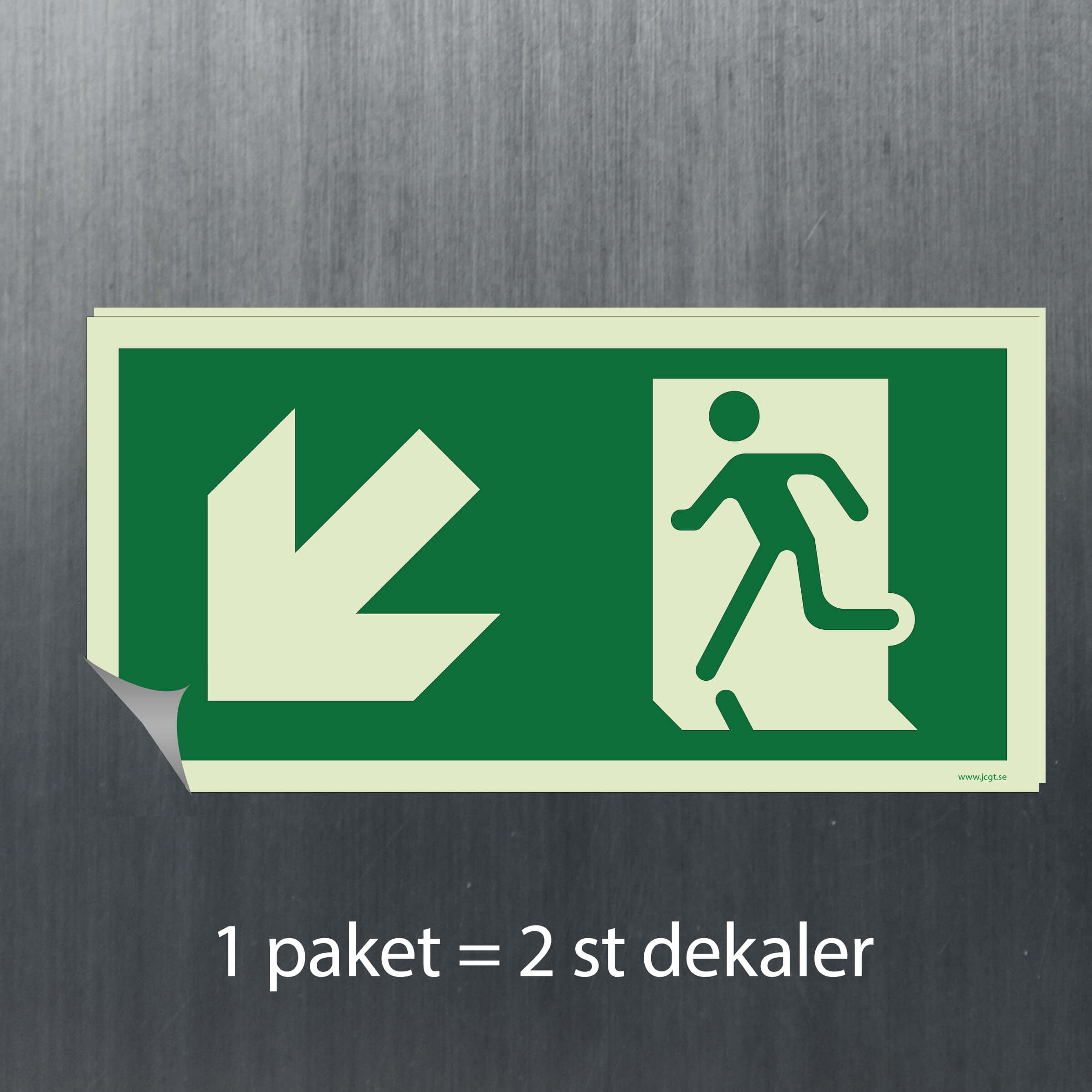 En Utrymningsskylt Ner till vänster som pekar ut vägen till den närmsta nödutgången.