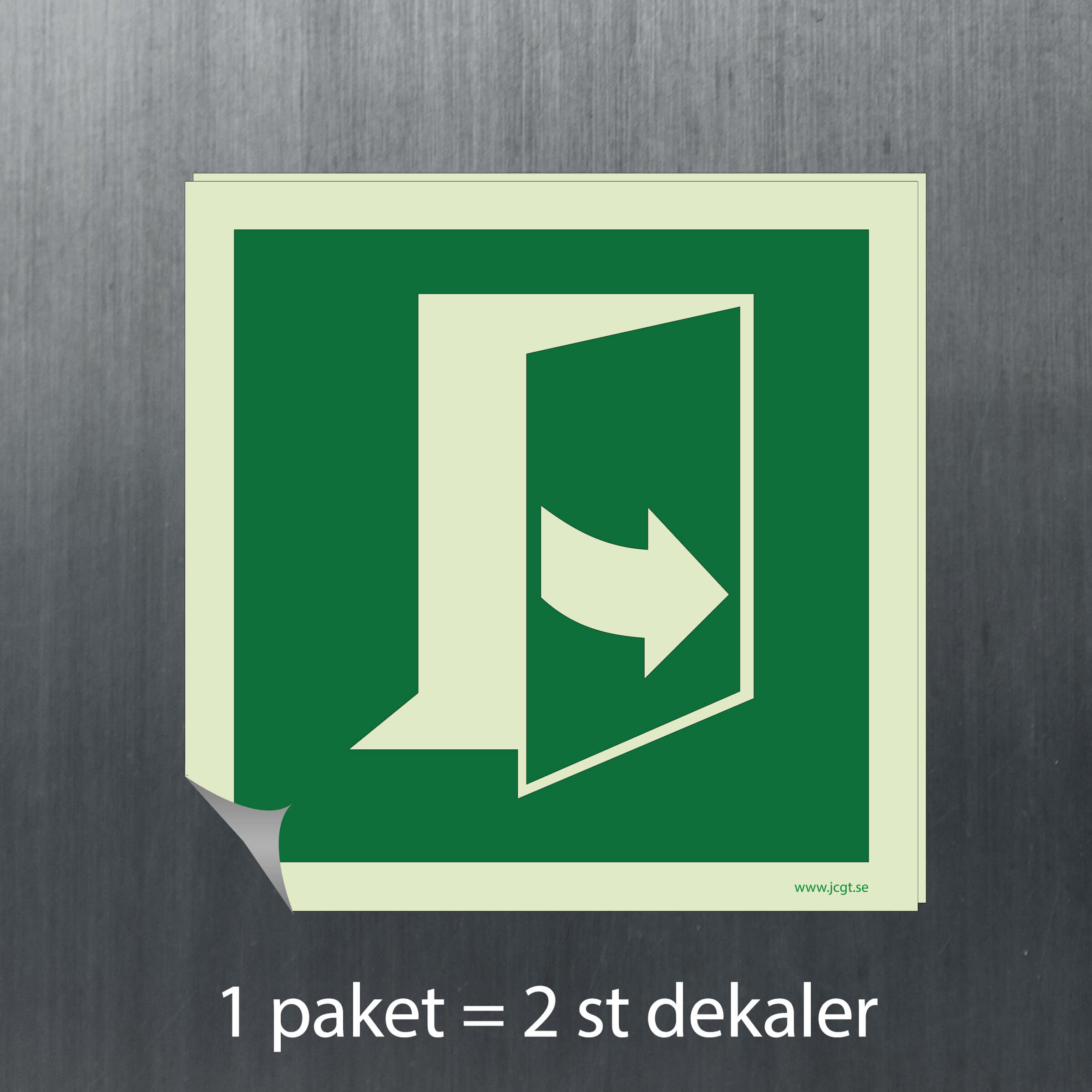 Utrymningsskylt Öppna dörr dra från vänster att sätta vid nödutgången och visa hur den öppnas. Efterlysande färger, välj mellan olika material och storlekar.