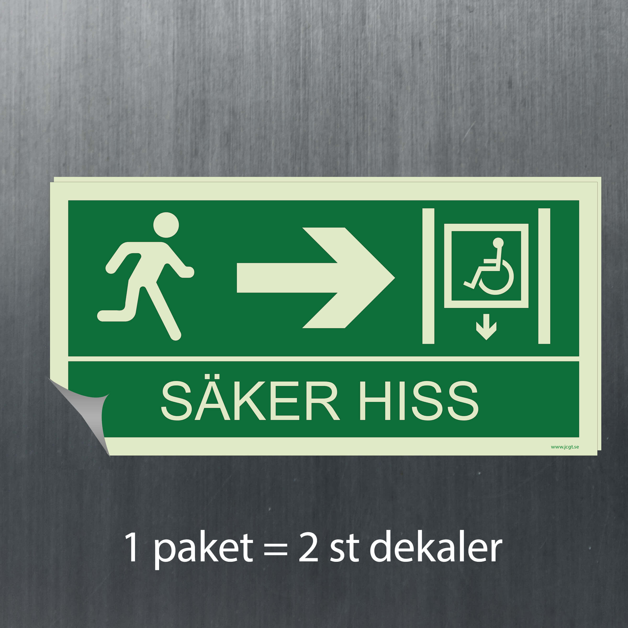 En nödutgångsskylt som visar att närmsta säkra hiss för funktionshindrade finns åt höger