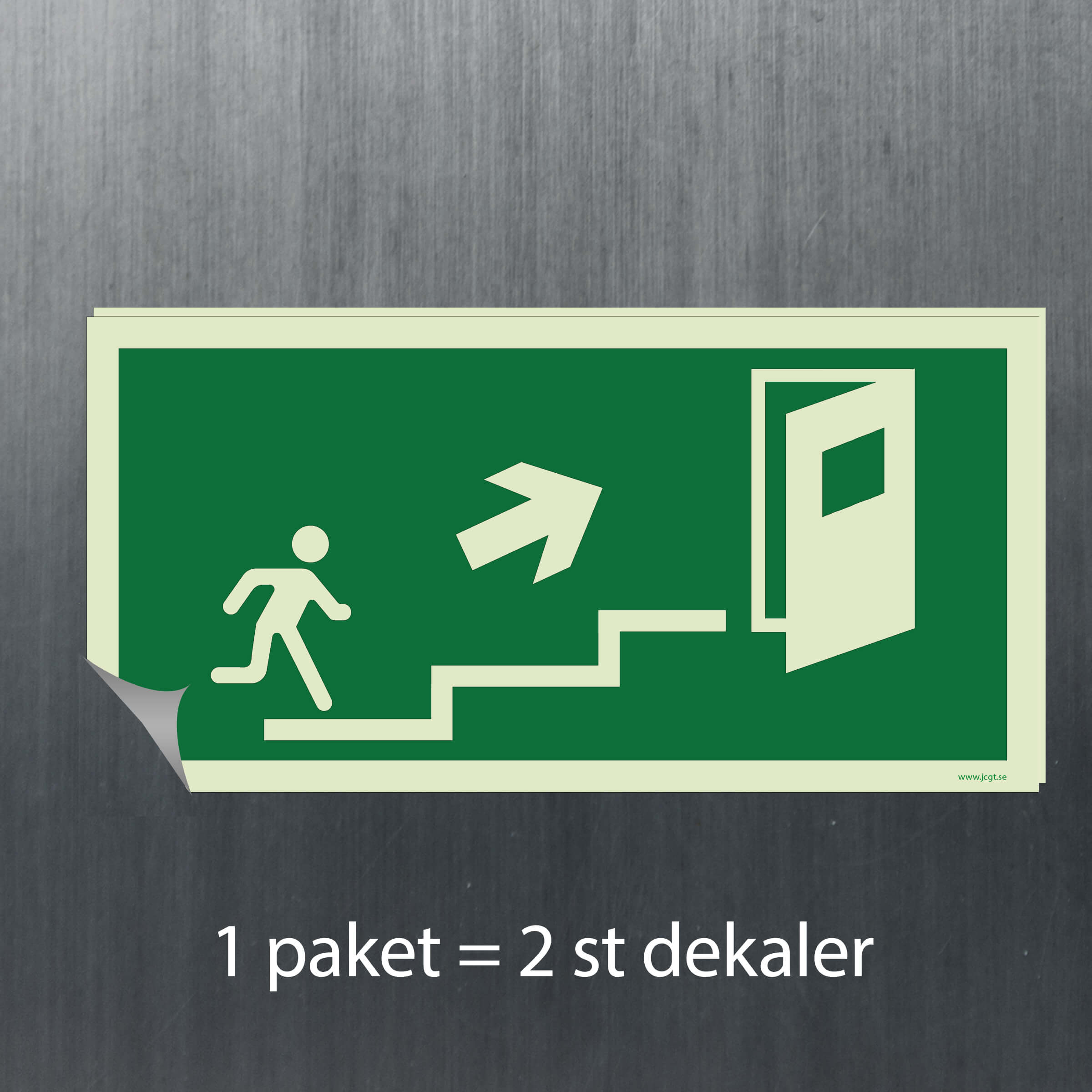 En Utrymningsskylt Trappa upp till höger som pekar ut vägen till den närmsta nödutgången.