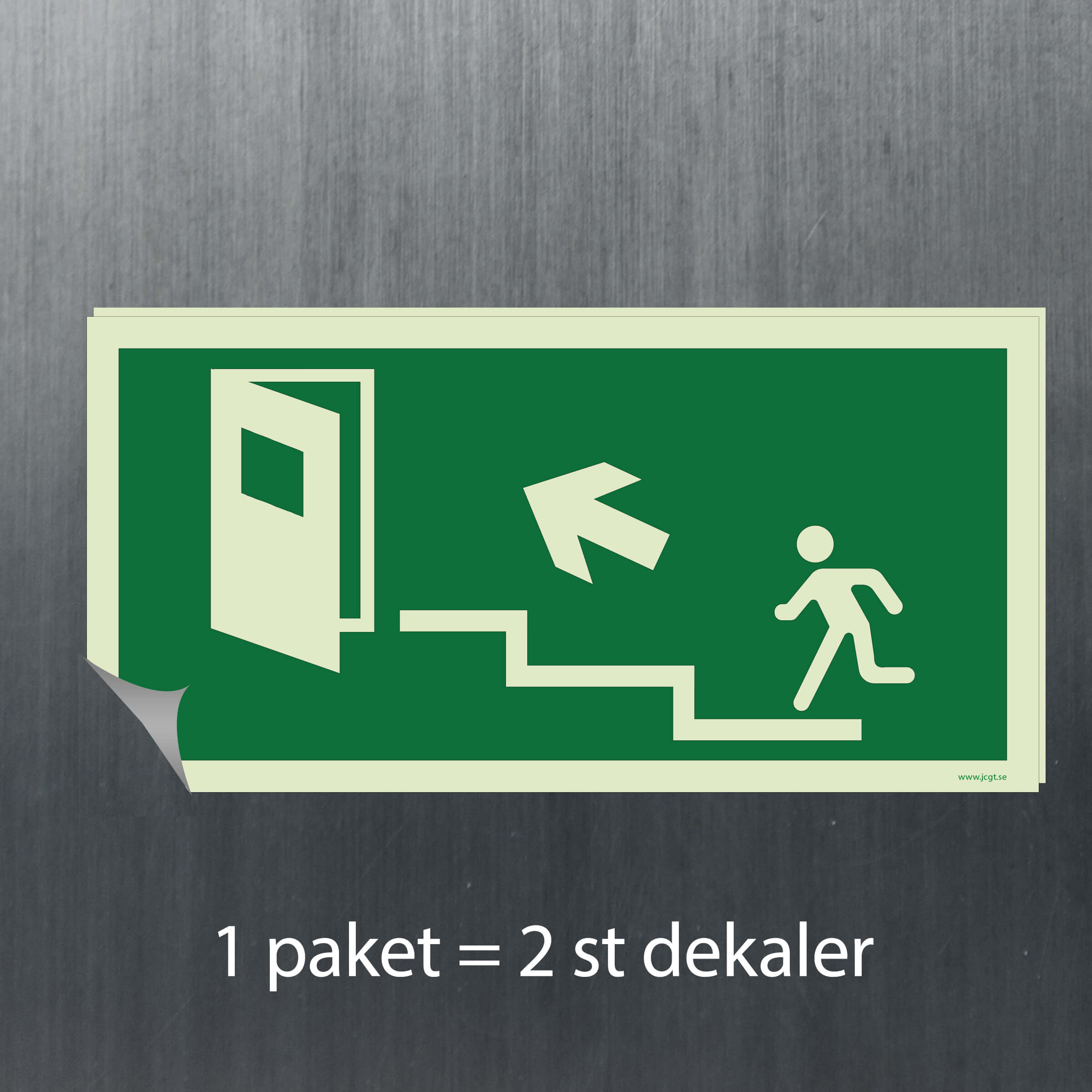 Utrymningsskylt Trappa upp till vänster
