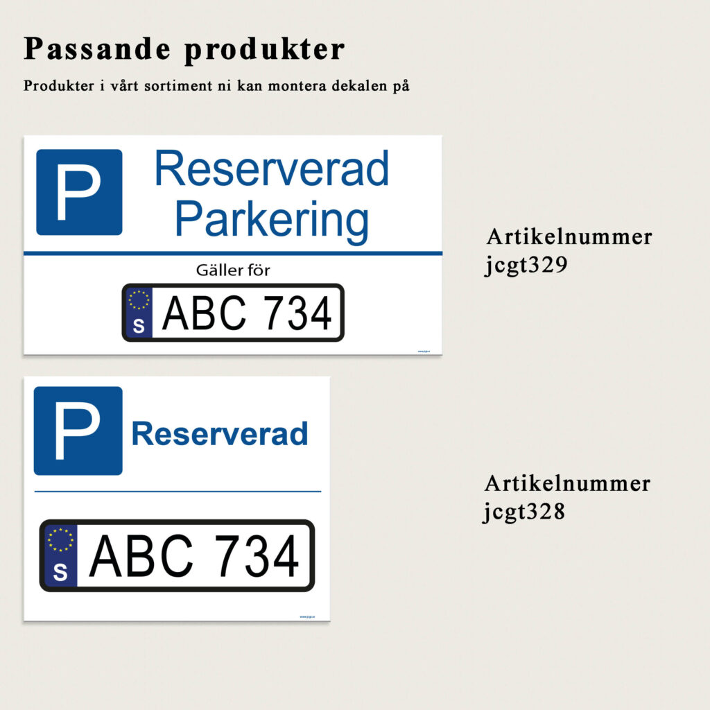 Skriv in er bils registreringsnummer, eller ert förnamn, och få en klisterdekal som ni kan montera upp på en plan vägg eller skylt. Har ni en reserverad parkeringsplats där endast er bil får stå så kan en dekal med ert reg.nummer vara en tydlig markör som visar detta.